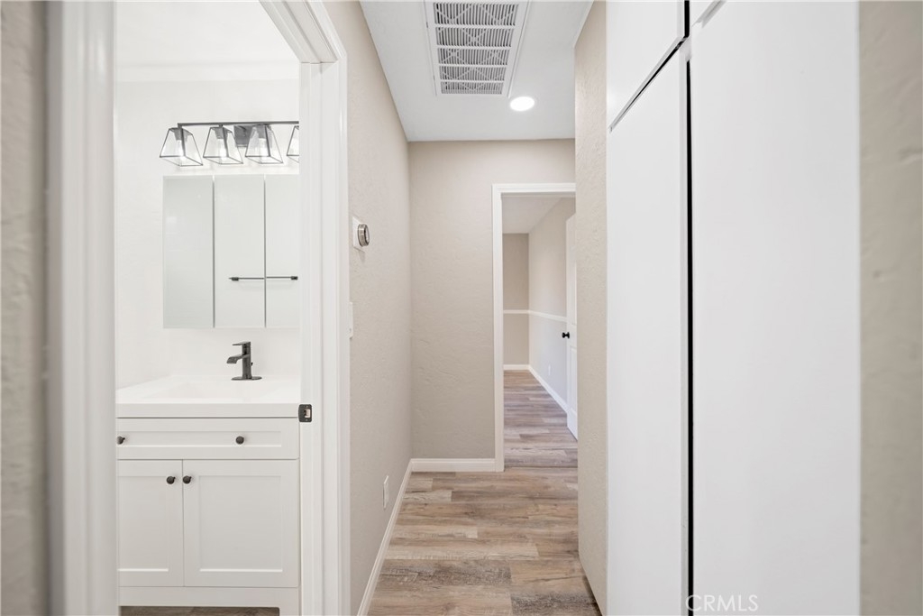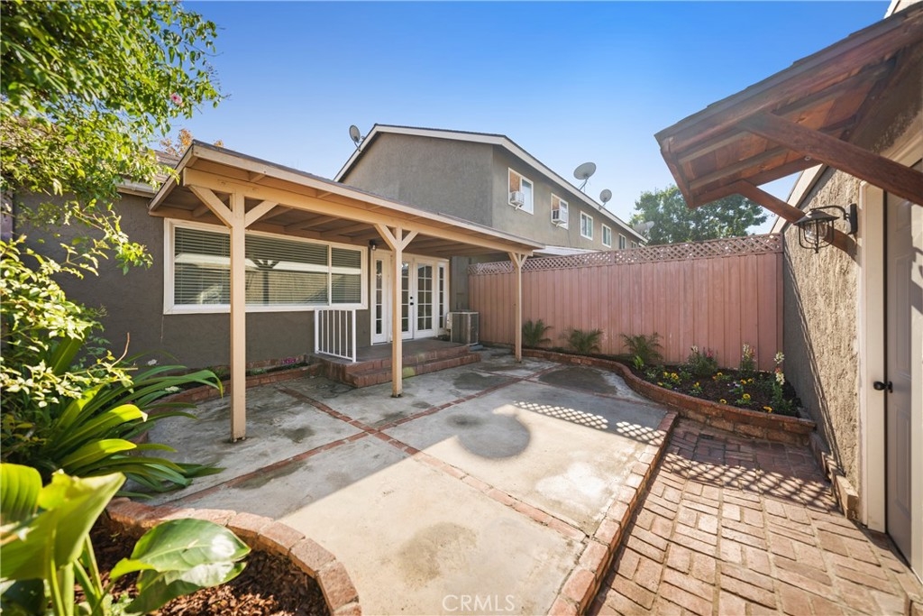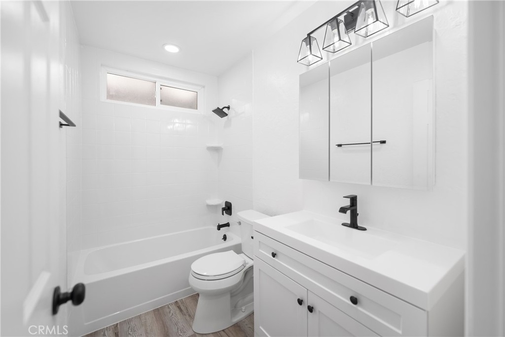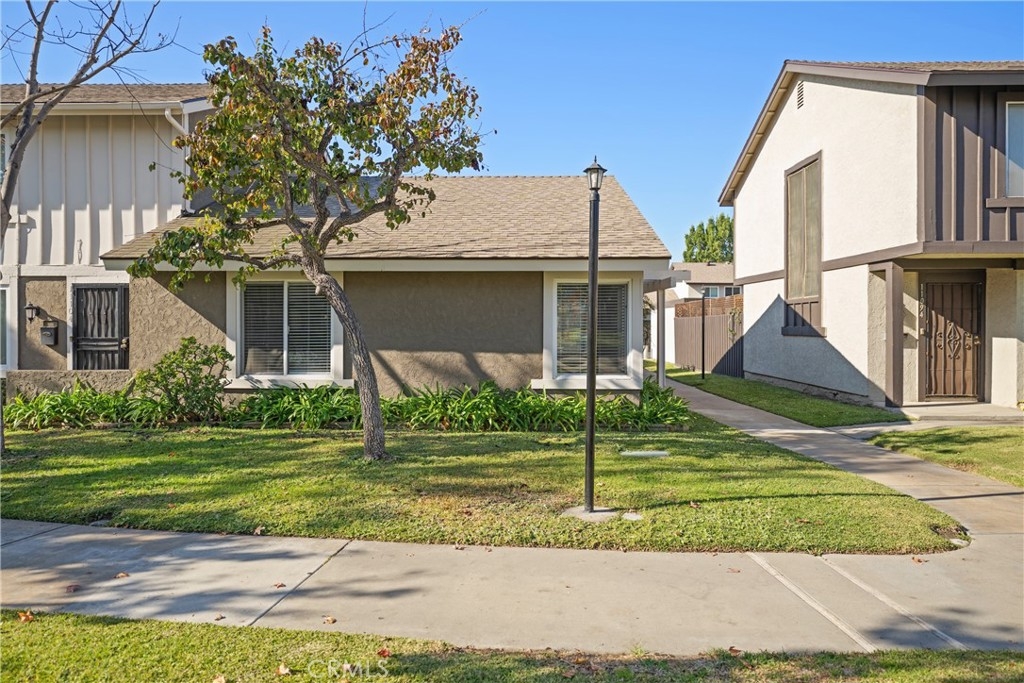LOCATION, LOCATION, LOCATION, CORNER UNIT! Welcome home to the most stunning, remodeled home available in the highly sought after community of Bradford Place, in Stanton! This unit's location gives you a beautiful landscaped extra greenbelt as you walk down to the entryway of your remodeled home! As you enter the property you are greeted by brand new LVP floors throughout, high, white baseboards, custom light gray paint, new recessed lighting, and new blinds throughout, making the entire home practically brand new! The sought after floor-plan flows from the main great room with large, double pane windows, that look out to the gorgeous private patio. The great room is open to the spacious eating nook with french doors to the patio which flows into the brand new, remodeled kitchen. The kitchen has been updated with shaker style white cabinets, stainless steel appliances, subway tile, and white quartz counters with black finishes. The updated bath features a brand new vanity, mirror, toilet and shower tub combo with black finishes. The two bedrooms are both generously sized, one slightly bigger then then other making it the master bedroom, both featuring mirrored closets, with beautiful views of the courtyard. The private patio is spacious and boasting gorgeous greenery surrounding the sitting areas, with access to the two car garage. The community features a pool, kids pool, club house, and common grass area courtyard. The home is within walking distance to major shopping and dining and personal amenities as ell as between Disneyland and Knotts Berry Farm, minutes to Huntington Beach and in the Garden Grove School District! This is a home you don't want to miss!