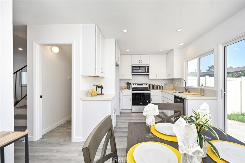 Welcome home! This fantastic townhome has been extensively remodeled and is ready for you to call home. The front storm door and the front door are both brand new as you enter. Gorgeous laminate flooring awaits you and runs throughout the house. Recessed lighting really updates and adds to the remodeled feel. The kitchen has new everything! The shaker cabinets, counters, Stainless steel sink, stainless steel dishwasher, stainless steel microwave and stainless steel stove are all brand new and unused. The amazing walk-in pantry and storage closet is huge. The brand new dual pane windows and slider really look great and help keep your home's temperature comfortable and the sounds out. Speaking of temperature, the heaters are all brand new too! Both bathrooms are also brand new with new vanities, toilets, sinks, and tub surround. The unit has great natural lighting throughout. The two car garage has drywall throughout, an automatic door opener and is oversized for a little extra storage. Your personal laundry can be found there. The backyard/courtyard that separates the garage from the unit is spacious and adds to the feel of a roomy home. This is a terrific place to entertain and enjoy our sunny SoCal weather! The new fence is vinyl and looks fantastic. This interior tract location is quiet with no street noise. The low HOA fees cover your common area maintenance, reserve items such as roofs and trash. Welcome to Bradford Place!