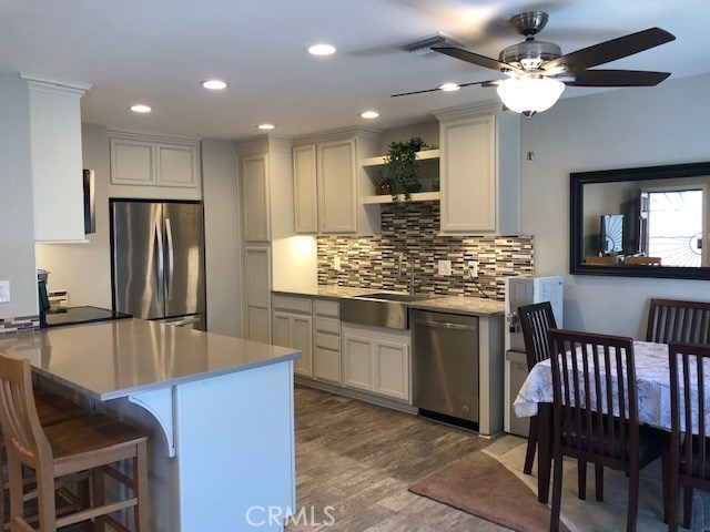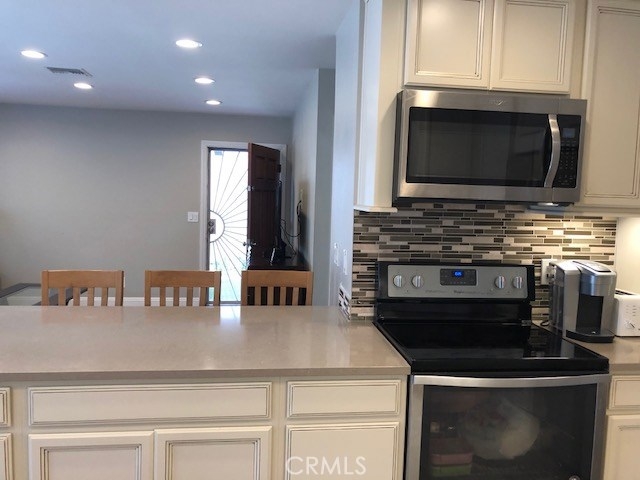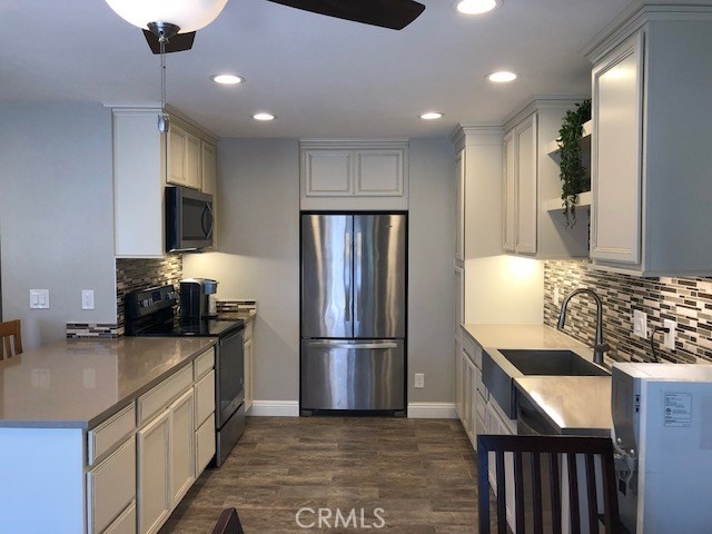 This beautiful single story home is turnkey!!! It has been completely remodeled. The kitchen has an open floor concept, breakfast bar counter, stainless steel appliances, premium color finish maple wood cabinets, quartz countertop, glass mosaic backsplash, under cabinet lighting, new fixtures and a stainless steel farmhouse apron front sink. Bathroom remodel has porcelain tiling in shower, glass door, new -vanity, toilet & fixtures. Bedrooms have premium waterproof laminate flooring mirrored closet doors. The rest of the home has porcelain tile with the look of hardwood planks. Other items recently installed inc. new ducting with new HVAC system, copper plumbing, copper electrical wiring, dual pane windows w/ slide blinds, ceiling fans, paneled doors w/ new hardward, recessed lighting, water softener, all new drywall throughout entire home and garage with heavy duty insulation for noise reduction and energy efficiency, private patio is landscaped with drought resistant plants and leads to the finished off 2 car garage with laundry hookups. The Bradford community is beautifully landscaped with mature trees, playgrounds, pools and greenbelts. Low HOA at $235 per mo. FHA and VA approved.