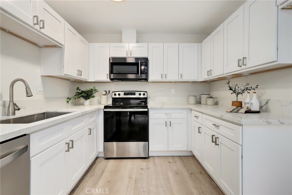 Single-level townhome on desirable street in the community of Bradford Place, in Stanton. New luxury vinyl wood floors, new paint and new doors compliment the bright and open floor plan. The kitchen features fresh white cabinets, stainless steal appliances, quartz countertops, and separate eating area with slider to the backyard. The living room flows seamlessly from the kitchen and features light-catching windows and ceiling fan. Two generous size bedrooms are located down the hall and share the updated bathroom. Relax in the private backyard with room for entertaining. In addition this home has a two car garage and laundry which makes for easy living. Close to schools shopping and entertainment! Welcome Home!
