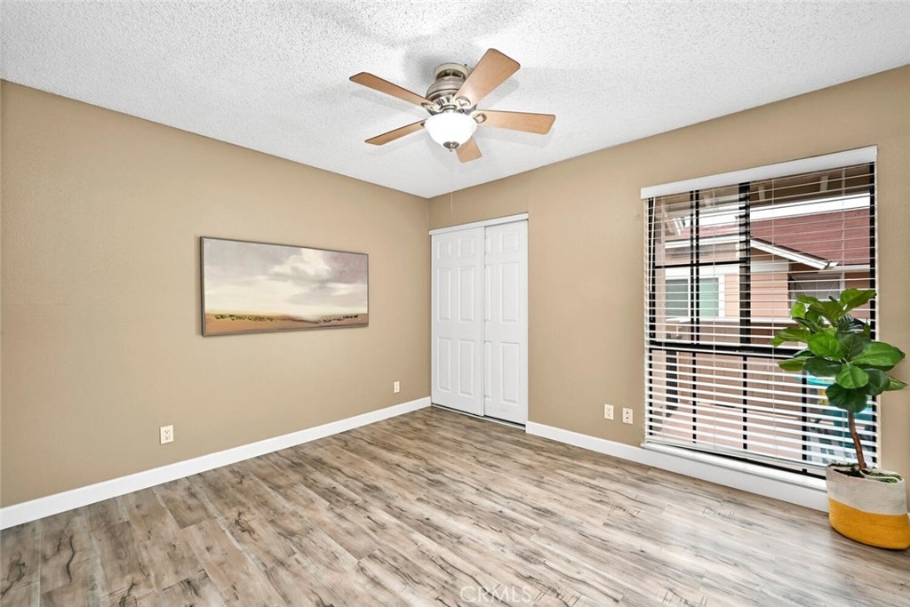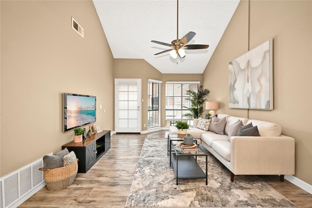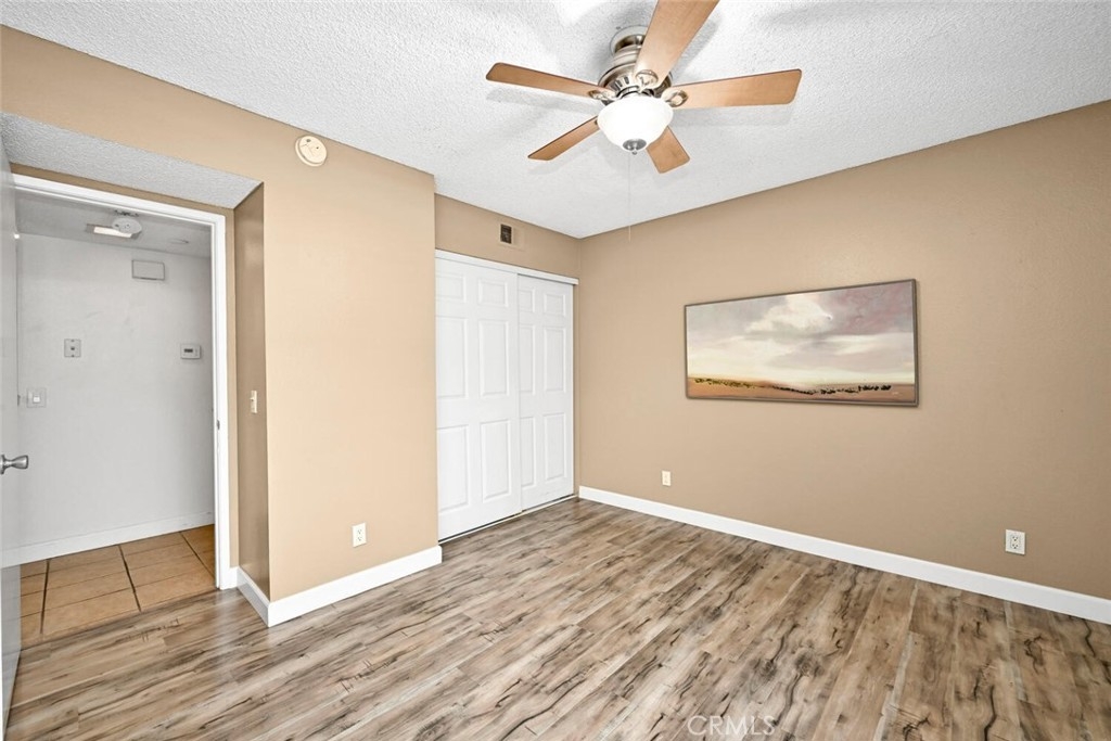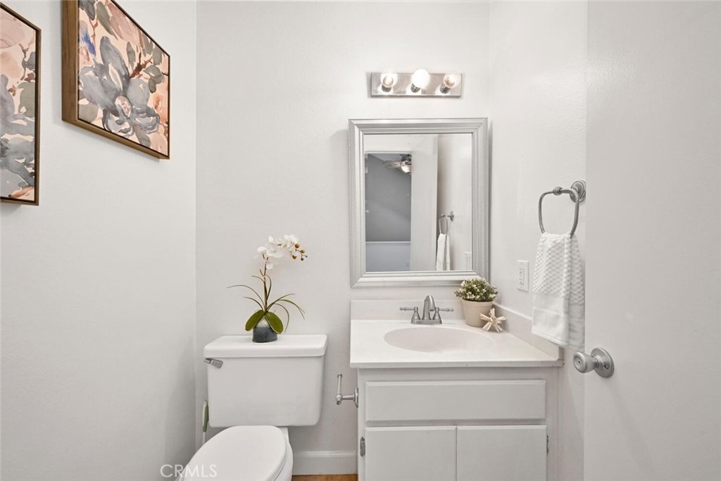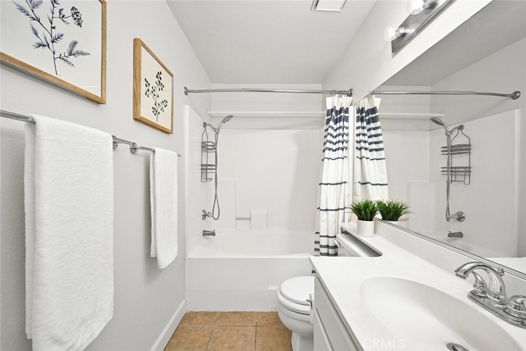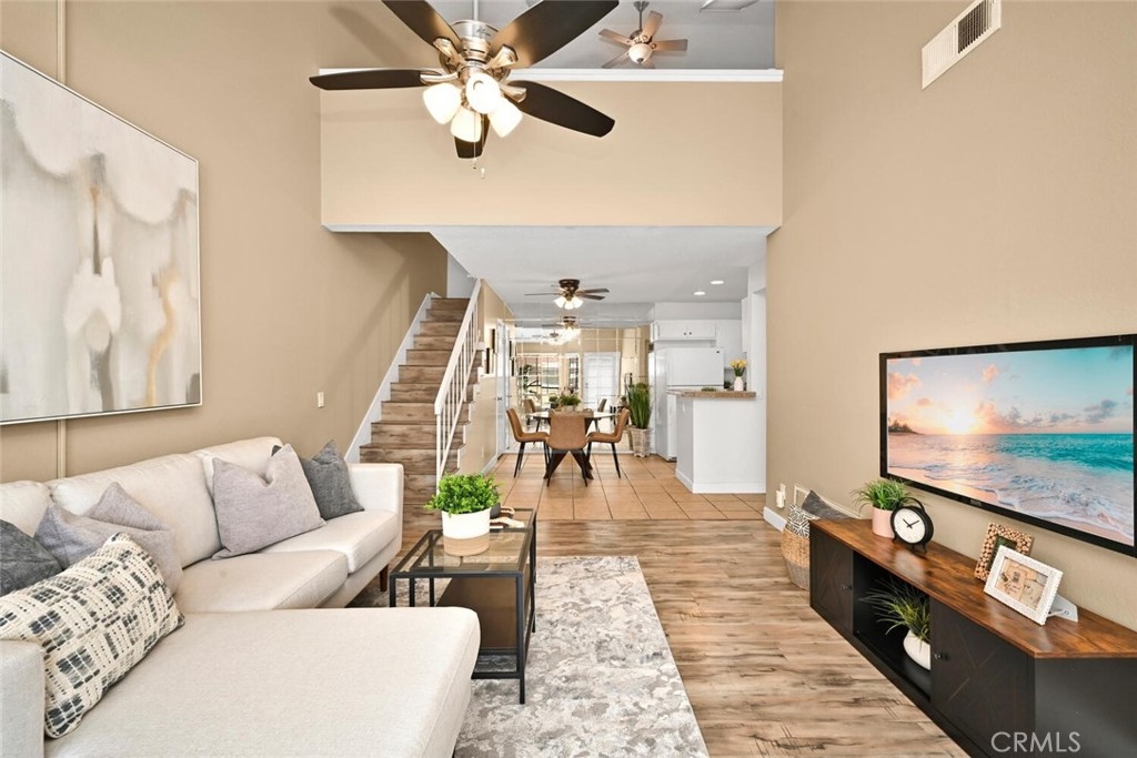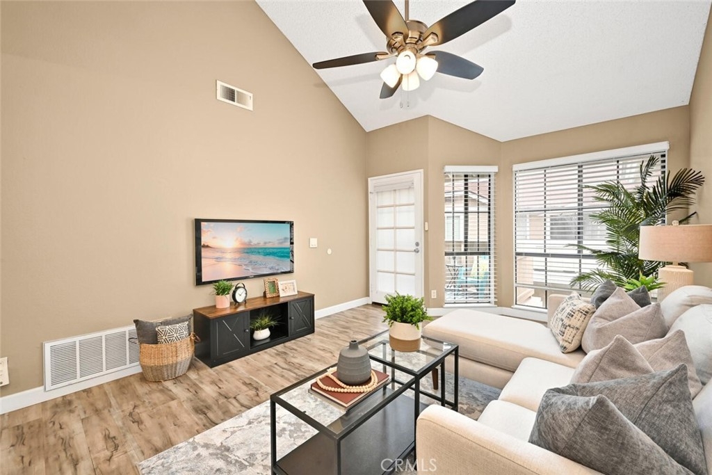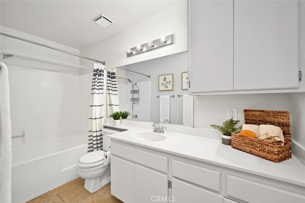 Welcome to this delightful condominium within the gated community of Crosspointe Village in Stanton. This nicely maintained, two-level home features an open floor plan with two bedrooms and one and a half bathrooms. The second bedroom is a large upstairs loft with a half bathroom and a large walk-in closet. As you enter, you'll be greeted by the inviting living space with vaulted ceilings, new paint, ceiling fans, and laminate flooring, creating a spacious and comfortable living area. This well-designed condominium offers plenty of storage space, making organization a breeze. The upstairs bedroom/loft is a versatile space with a private half bathroom, a walk-in closet, and skylights, allowing natural light to illuminate the room. The laminate flooring throughout adds a touch of warmth and durability. Crosspointe Village provides an array of amenities for residents to enjoy. Dip in one of the three pools or relax in one of the spas. The greenbelt areas provide a peaceful setting for leisurely walks. The community also offers 24-hour security at the gate, ensuring safety and peace of mind. Convenience is a highlight of this condominium, with the assigned covered carport No. 775 just a few feet from the unit. Additionally, the location is ideal, with easy access to freeways, shopping centers, and the new Rodeo 39 Public Market, offering various dining and entertainment options.