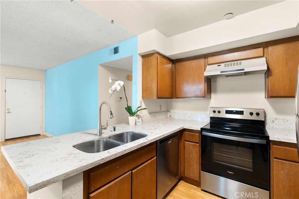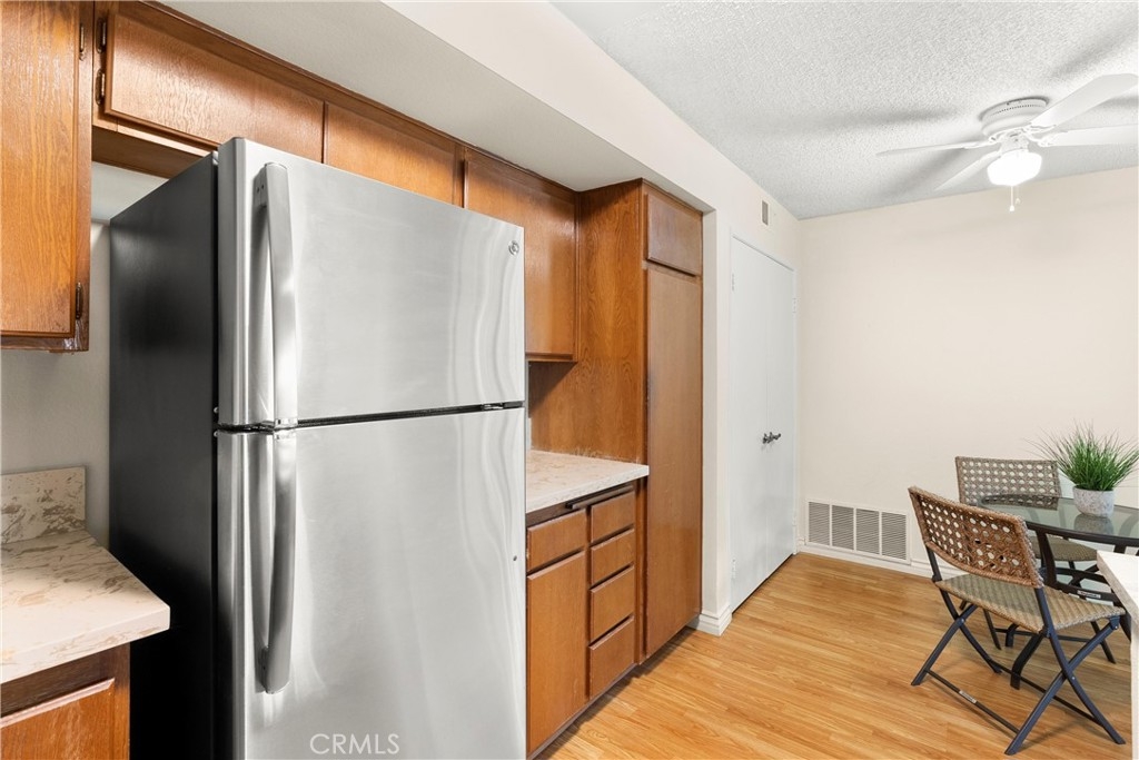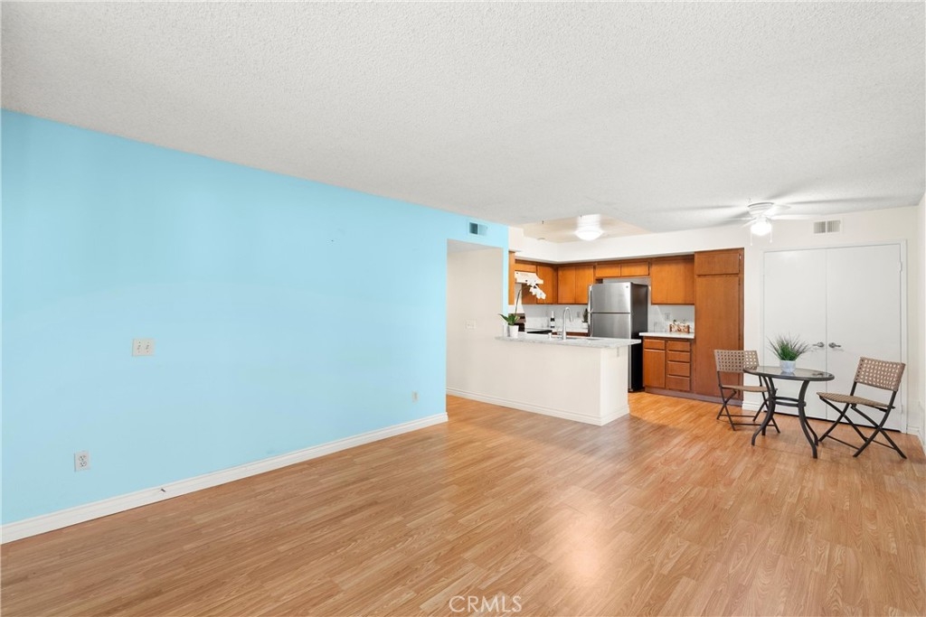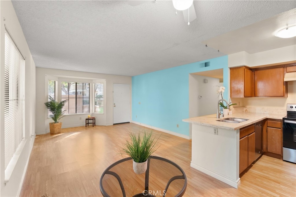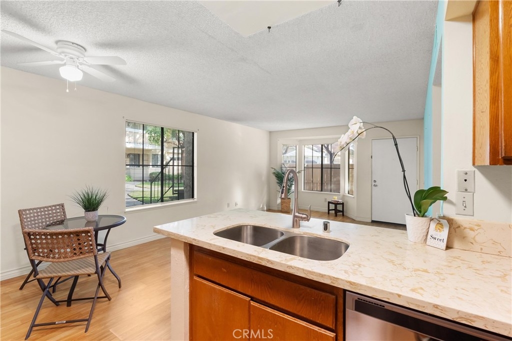 Amazing location in the center of the complex with a view of a large greenbelt. This first floor downstairs end unit condo is very popular. Enter through a private patio. The open concept living space has a bay window and a dining window to allow for great cross ventilation. Lots of storage with a pantry and double door closet in the dining area. The primary bedroom is secluded at the end of the hall with a dressing area and vanity with sink right across from the walk-in closet. Full bedroom features a laundry closet located behind the hall bath door. The bath is shared through the primary bedroom or a second door to the hallway. Laminate flooring, central air, electric range, dishwasher and lots of other amazing features!