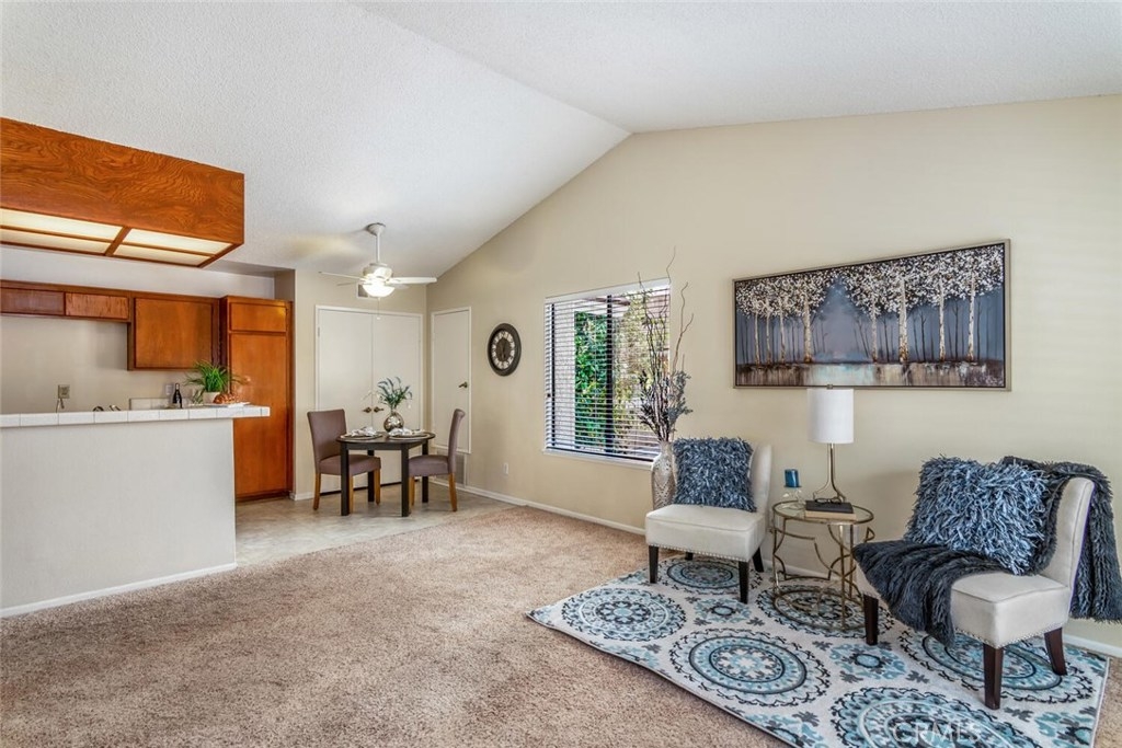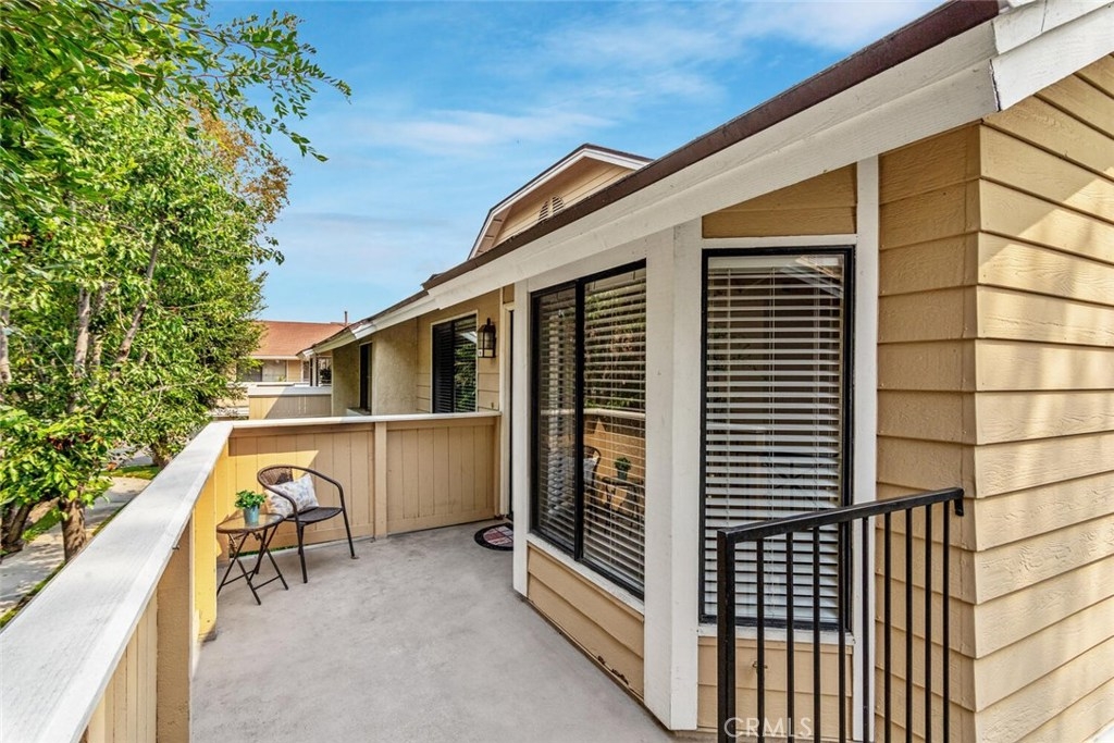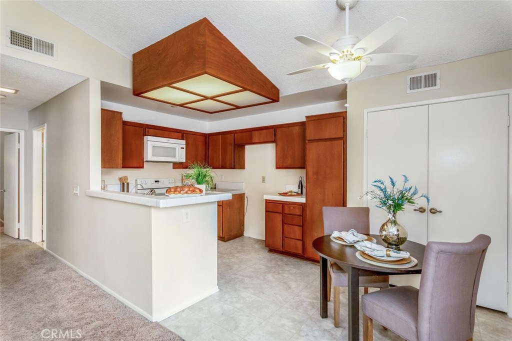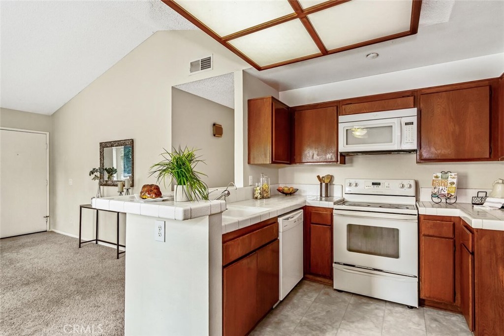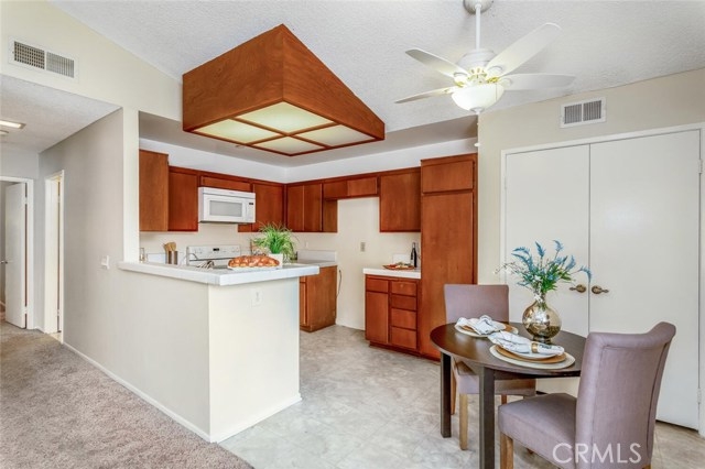 Popular upstairs end unit! Front door and most windows face west which allows the ocean breezes to cool down the home. When entering the condo there is a BAY WINDOW in the living room next to the front door. Open concept kitchen with pantry, ceramic tile counters, wood cabinets, built-in microwave, electric oven (gas hook up behind), dishwasher, garbage disposal and vinyl flooring. The bath is located off the hallway with a washer/dryer unit behind the bathroom door. The bath can also be accessed through the main bedroom. The main bedroom features: double door entry, walk-in closet and a dressing area with long vanity counter, mirror, sink and medicine chest. The water heater, CENTRAL AIR and heat have been changed in the last few years. Home has copper plumbing and attic access. The front deck is shaded by a large tree right out front. There is room for a small table and a couple of chairs. A BBQ can be used with a small propane tank and moved away from the building while using. The near by carport number #830 has storage lockers and is located in the building just north of this condo. The association is gated with 24 hour gate attendants at the North gate, 3 pools and spas, large greenbelt in the center of the complex the a gazebo and lots of shade trees and sidewalks. The complex is about 20 minutes to the beach by car. A great place to meet new friends.
