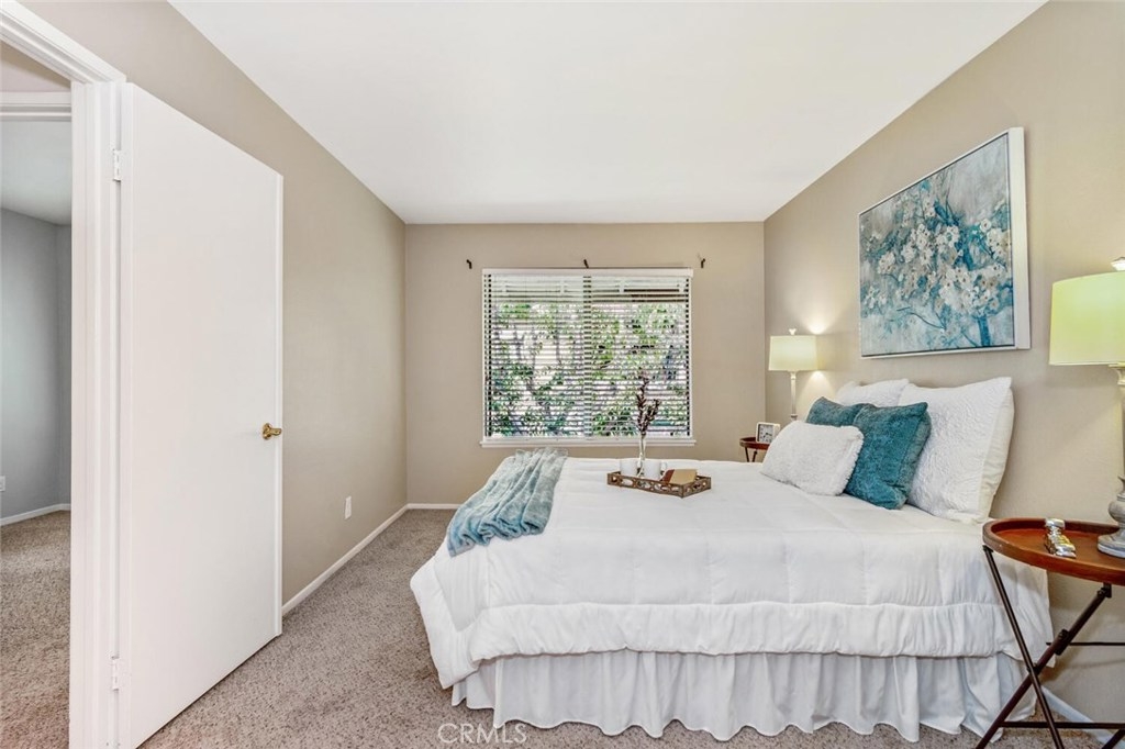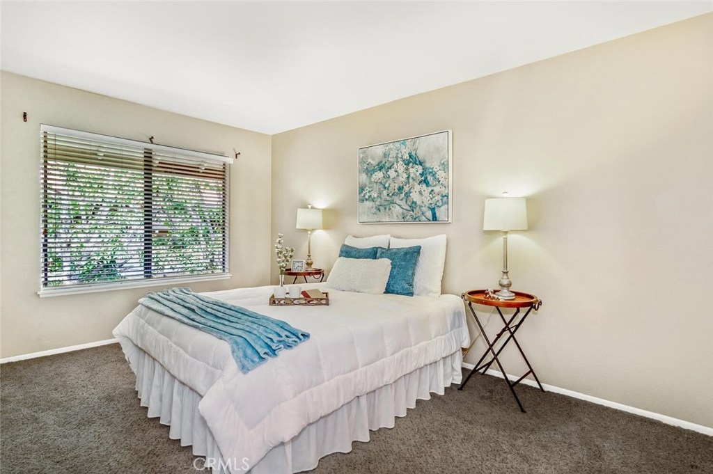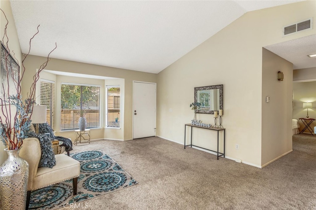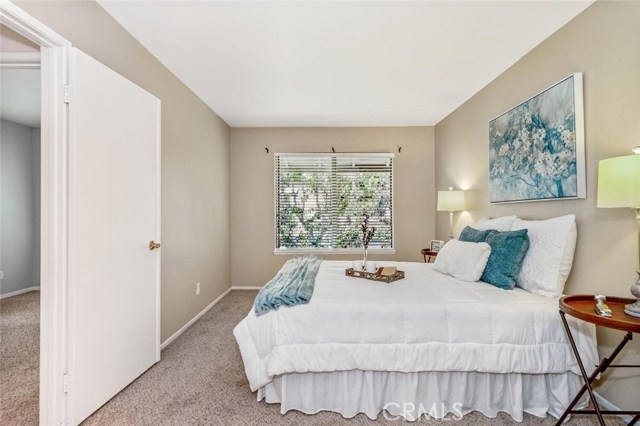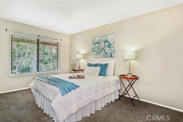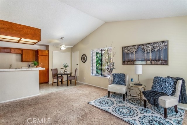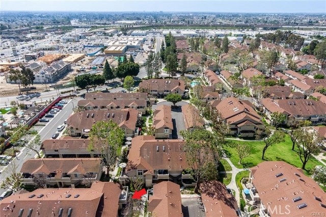 Popular upstairs end unit! Front door and most windows face west which allows the ocean breezes to cool down the home. When entering the condo there is a BAY WINDOW in the living room next to the front door. Open concept kitchen with pantry, ceramic tile counters, wood cabinets, built-in microwave, electric oven (gas hook up behind), dishwasher, garbage disposal and vinyl flooring. The bath is located off the hallway with a washer/dryer unit behind the bathroom door. The bath can also be accessed through the main bedroom. The main bedroom features: double door entry, walk-in closet and a dressing area with long vanity counter, mirror, sink and medicine chest. The water heater, CENTRAL AIR and heat have been changed in the last few years. Home has copper plumbing and attic access. The front deck is shaded by a large tree right out front. There is room for a small table and a couple of chairs. A BBQ can be used with a small propane tank and moved away from the building while using. The near by carport number #830 has storage lockers and is located in the building just north of this condo. The association is gated with 24 hour gate attendants at the North gate, 3 pools and spas, large greenbelt in the center of the complex the a gazebo and lots of shade trees and sidewalks. The complex is about 20 minutes to the beach by car. A great place to meet new friends.