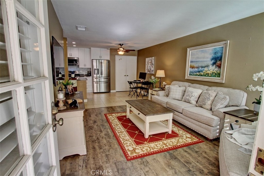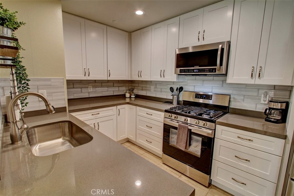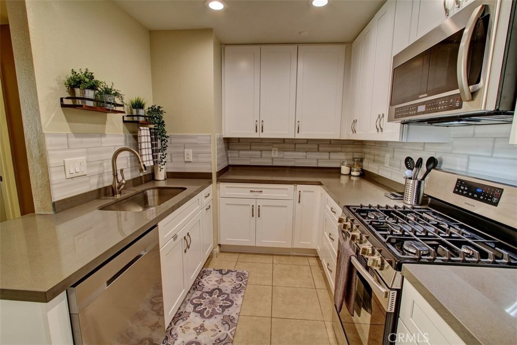 Upgraded and Move in ready Stanton Condo! This quaint, single level, condominium is located on the ground level. It opens up to a nice sized patio, perfect for a barbecue, and relaxing outside! Inside, a spacious living room leads to a dining area and Brand NEW KITCHEN with all new soft close cabinetry, quartz countertops and stainless steel appliances. The bedroom has two closets, brand new vinyl plank flooring and a large window that brings in natural light. The bath is all new from top to bottom too! Newer windows and Plantation shutters throughout. Includes a carport with storage. This home is situated among green belts lined with mature trees and landscaping. Three community pools and 3 spas. 24 hour security. Conveniently located near freeways, restaurants, and shopping! A quick walk to the new Rodeo 39 Public Market where you can eat, drink, and shop!