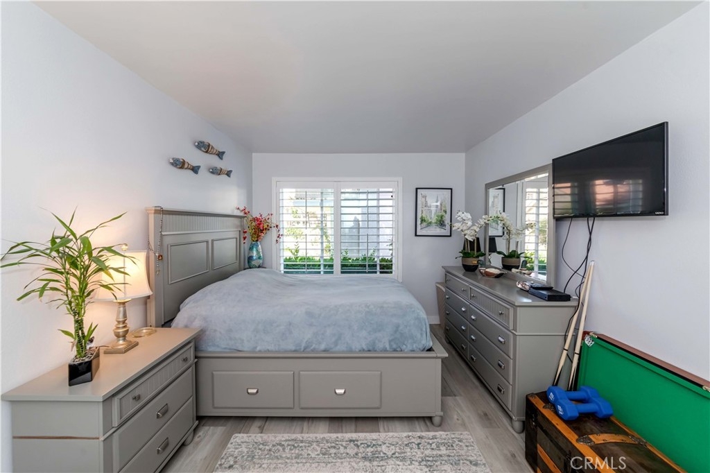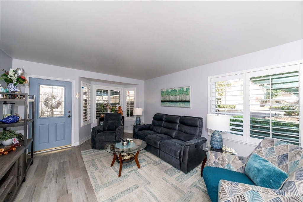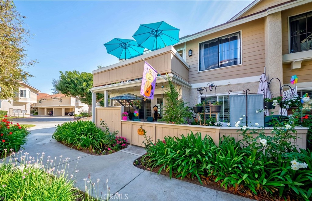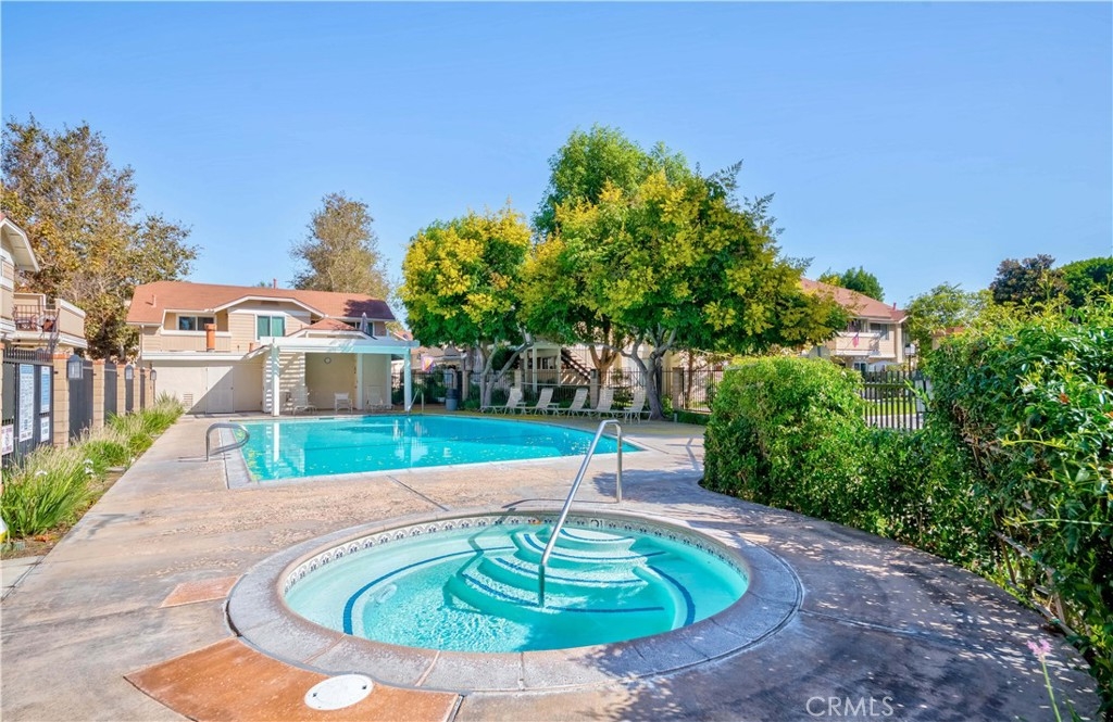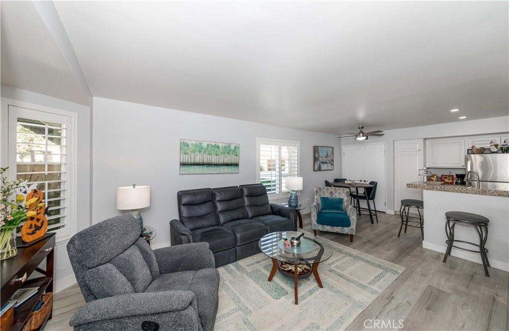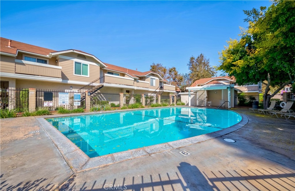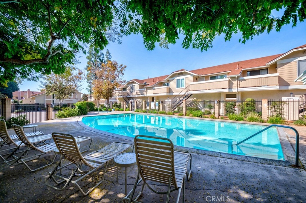 Crossoointe gated community with a live guard. Charming one level condo, end unit it is situated near one of the community swimming pools. This is a newer remodeled condo, it has a fresh and bright feel to it looks like a showcase. The living room is an open concept space to the kitchen with plenty of cabinets. It has a 3/4 bath with a barn door, and 2 bedrooms. The condo has plantation shutters throughout the living space and a bonus area used as an office space. This one won't last, you must come by and see for your self and 2 reserved parking spaces. It is conveniently nearby many restaurants and the 22 fwy.