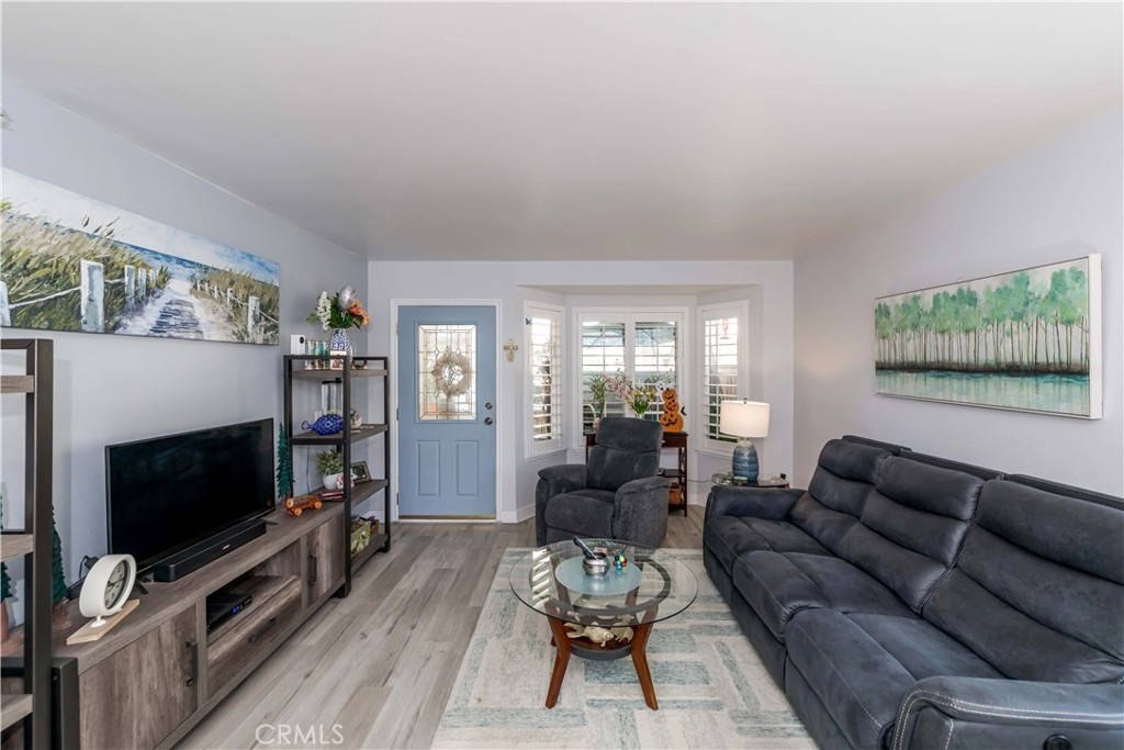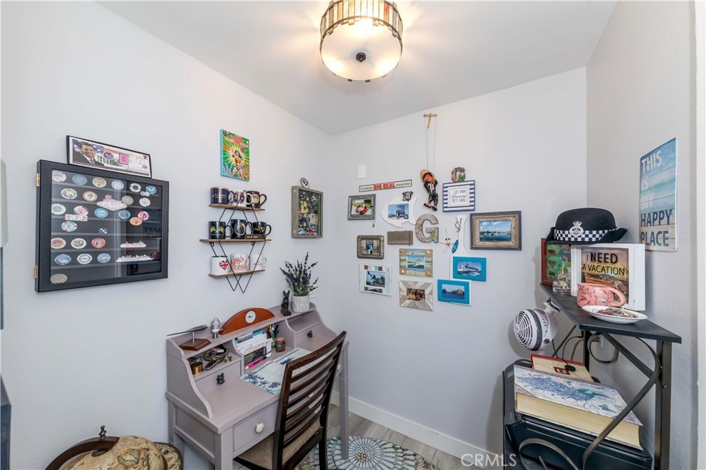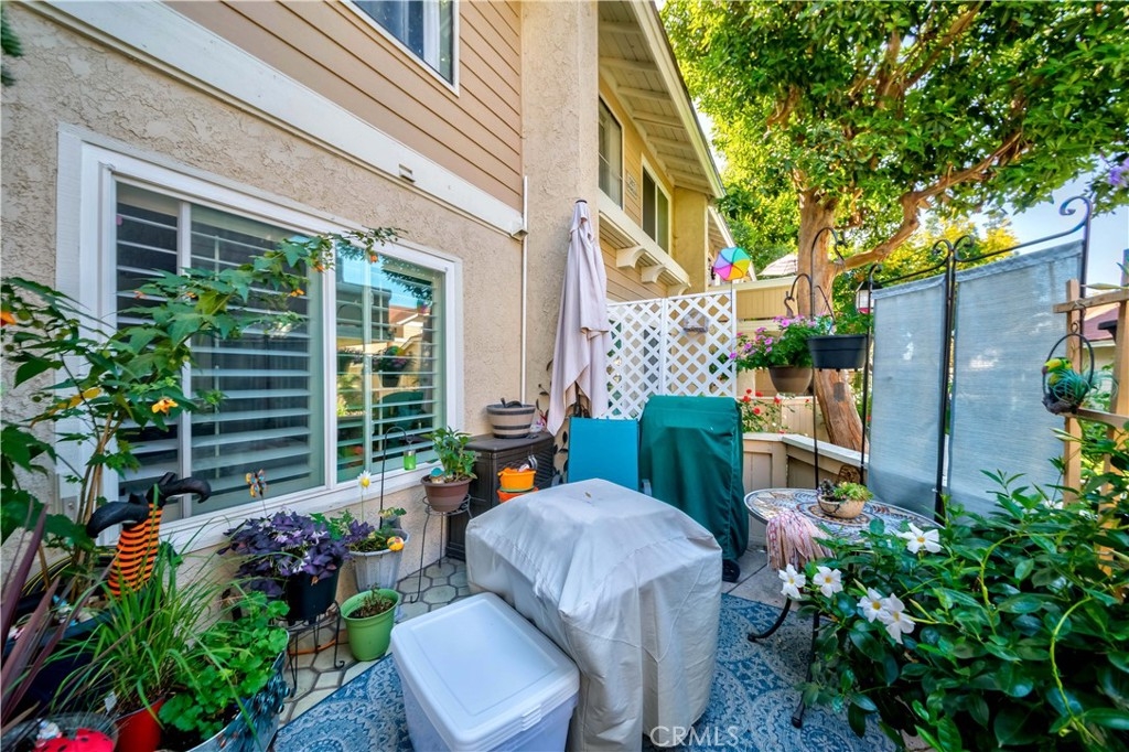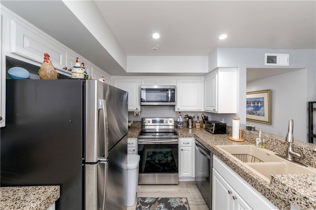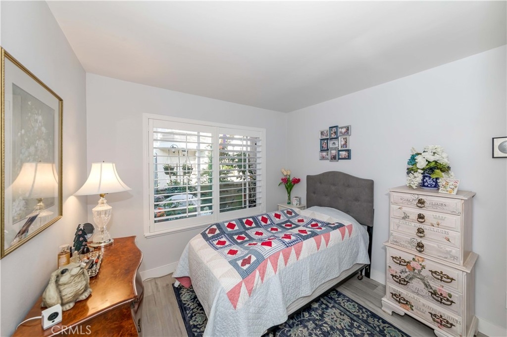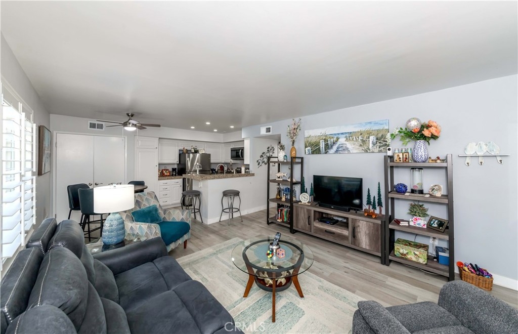 Crossoointe gated community with a live guard. Charming one level condo, end unit it is situated near one of the community swimming pools. This is a newer remodeled condo, it has a fresh and bright feel to it looks like a showcase. The living room is an open concept space to the kitchen with plenty of cabinets. It has a 3/4 bath with a barn door, and 2 bedrooms. The condo has plantation shutters throughout the living space and a bonus area used as an office space. This one won't last, you must come by and see for your self and 2 reserved parking spaces. It is conveniently nearby many restaurants and the 22 fwy.