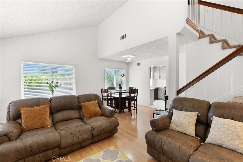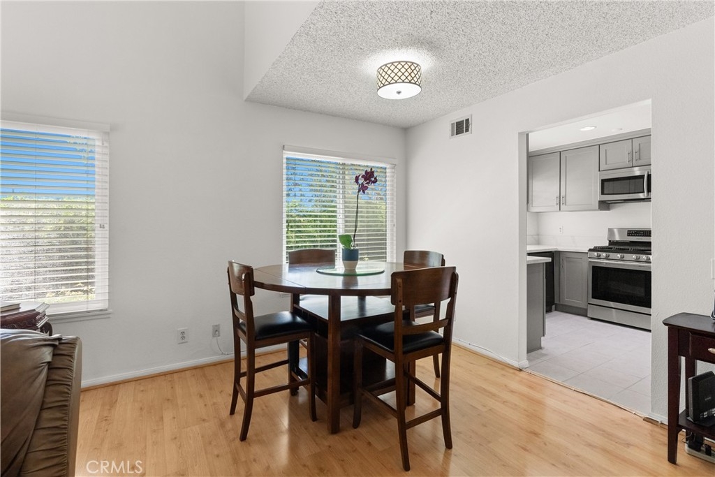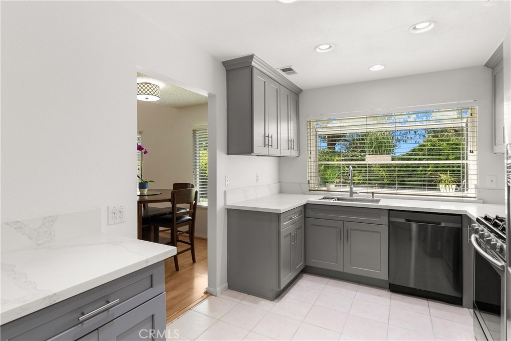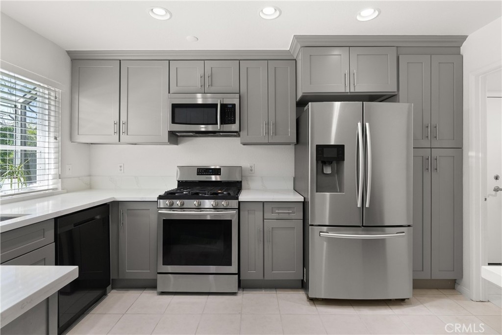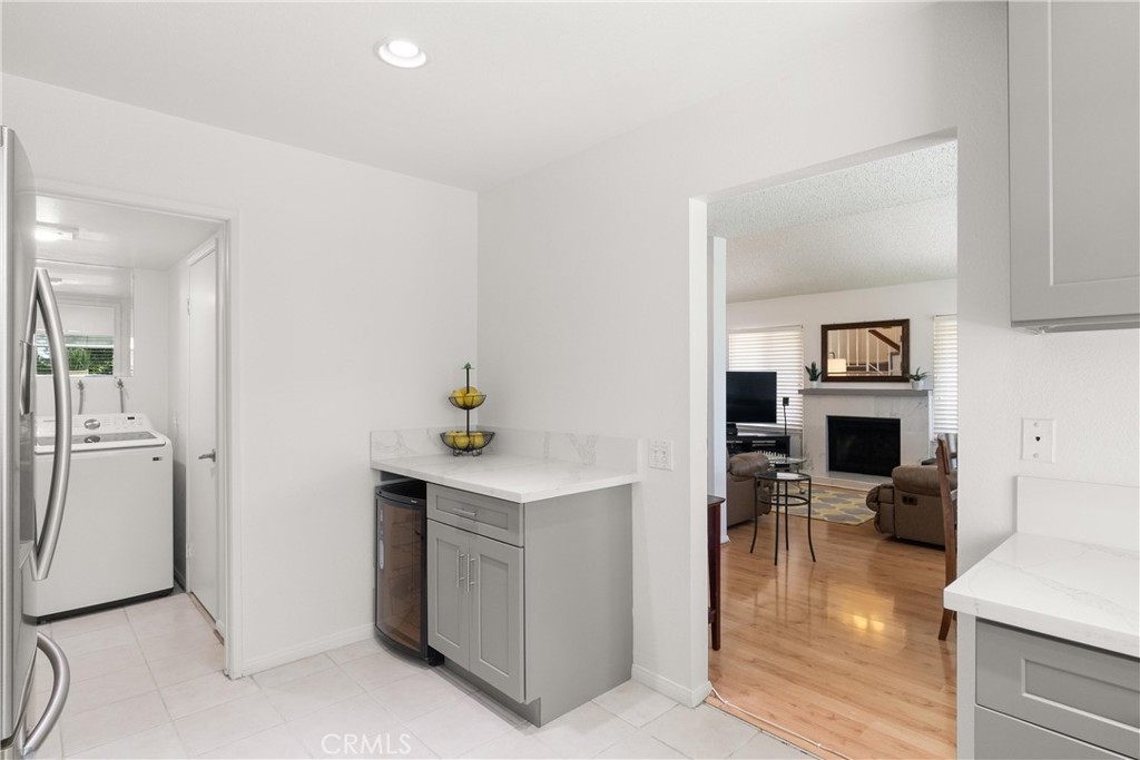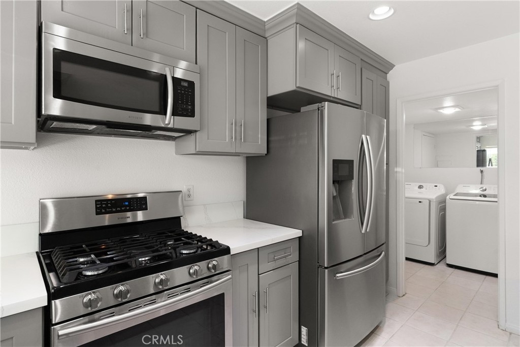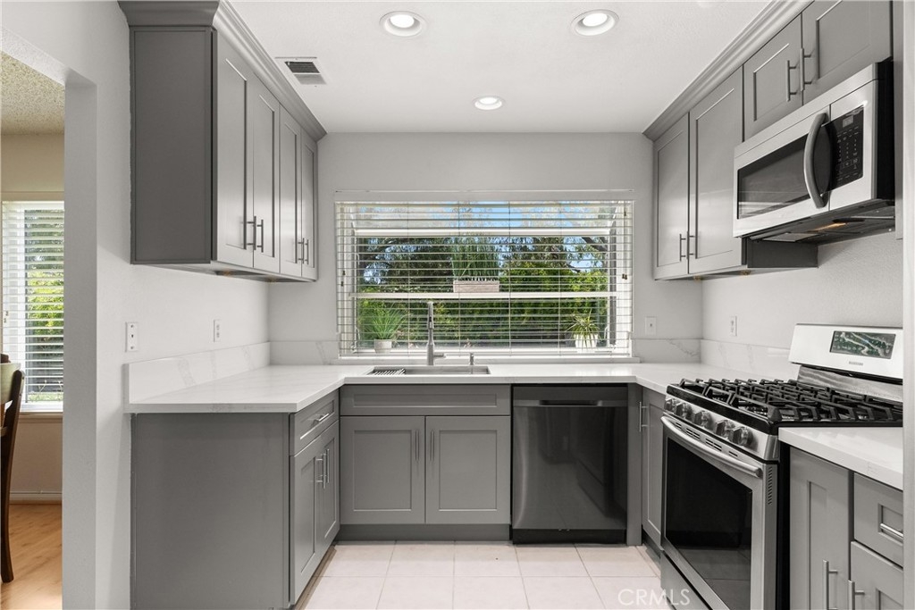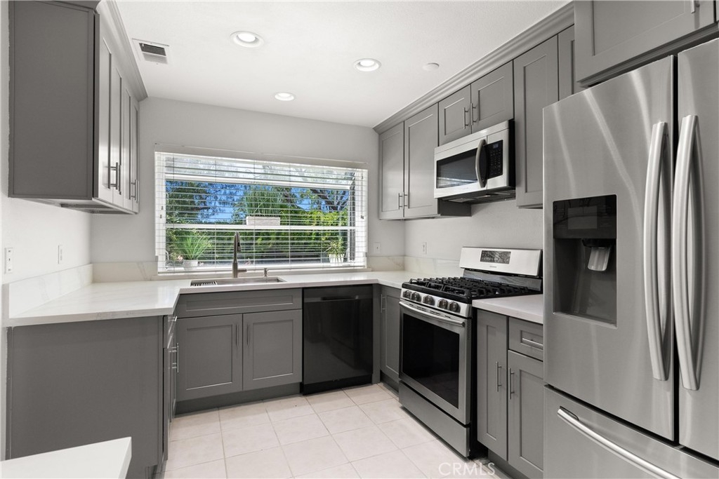 LARGEST FLOORPLAN at Crosspointe Village. This end unit, 2 story plan features: 3 Bedrooms, 2.5 Bathrooms and a 2 CAR GARAGE. 1,260 square feet seems much larger because the living room and primary bedroom have vaulted ceilings. Welcoming patio with top of the line security screen door allows cross ventilation and safety at the same time. The side windows face towards the west letting in the sea breeze nearly every afternoon, saving money on air conditioning usage! DUAL-PANE WINDOWS fill the space with natural light while enhancing energy efficiency. This kitchen has been REMODELED in 2022 with QUARTZ COUNTER & SHAKER STYLE CABINETS with soft close drawers and STAINLESS APPLIANCES! Extra cabinet has been with wine fridge would be great for a coffee station. Green house window above the sink looks out onto a greenbelt and landscaped wall. The undermount single kitchen sink with soap dispenser and Moen auto open/close faucet. Inside laundry room with full size washer and dryer with gas or 220 connections. Attached 2 CAR GARAGE with opener. Community is right behind the Rodeo39 Marketplace. Walk to dining, shopping, retail.
