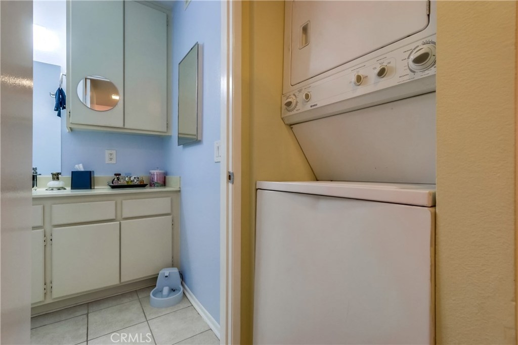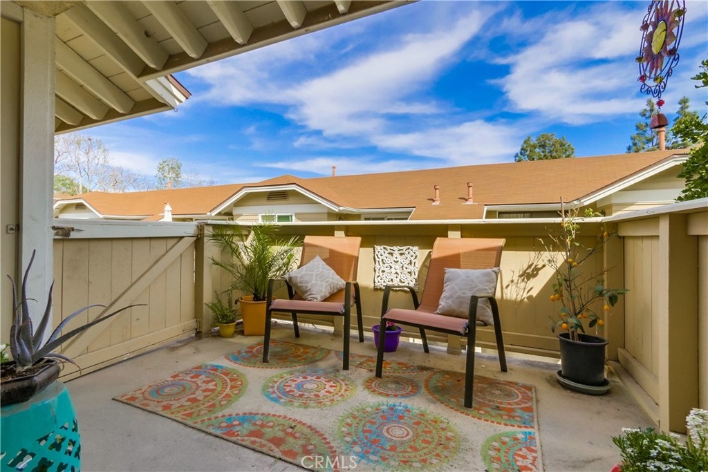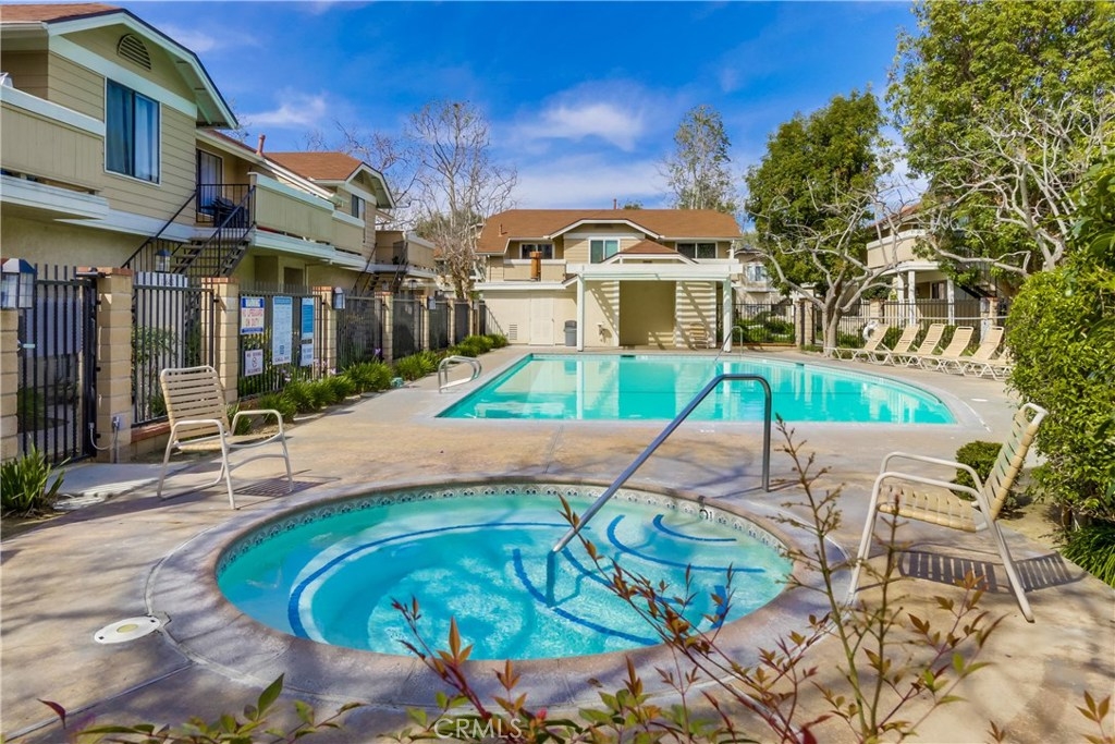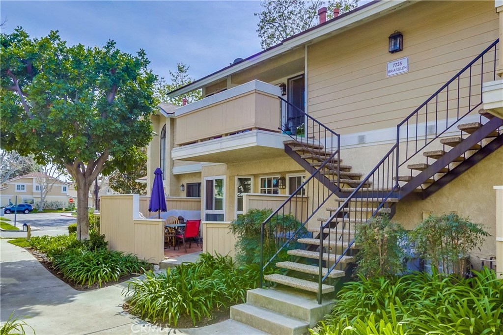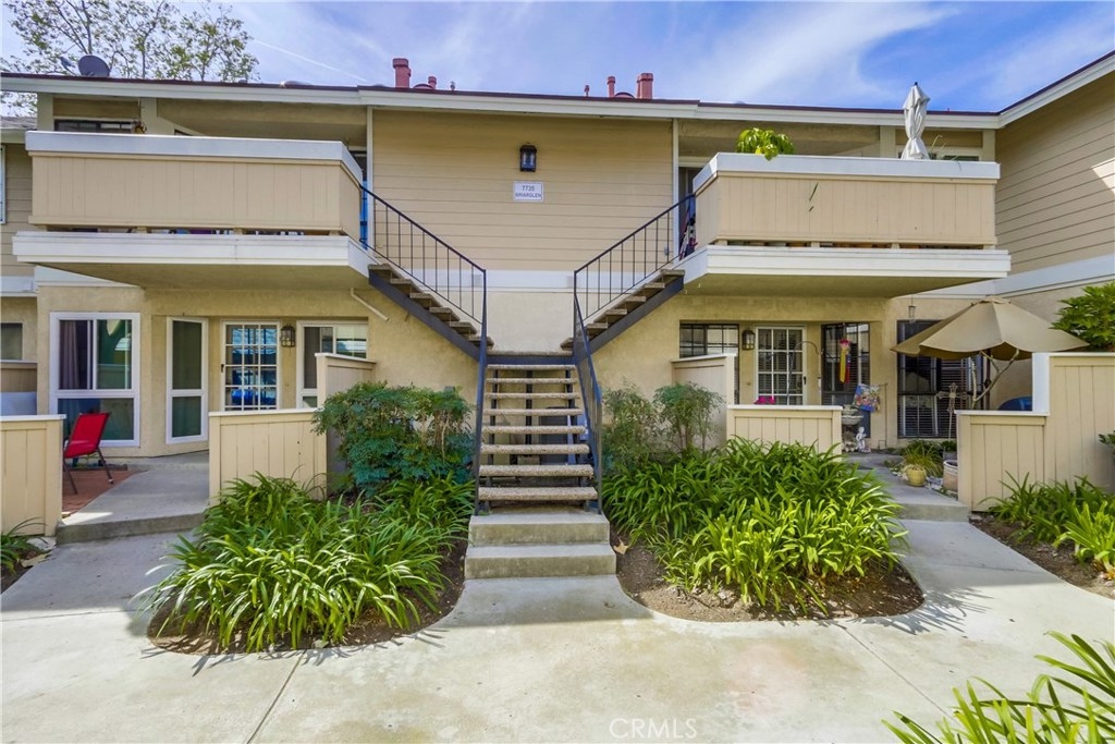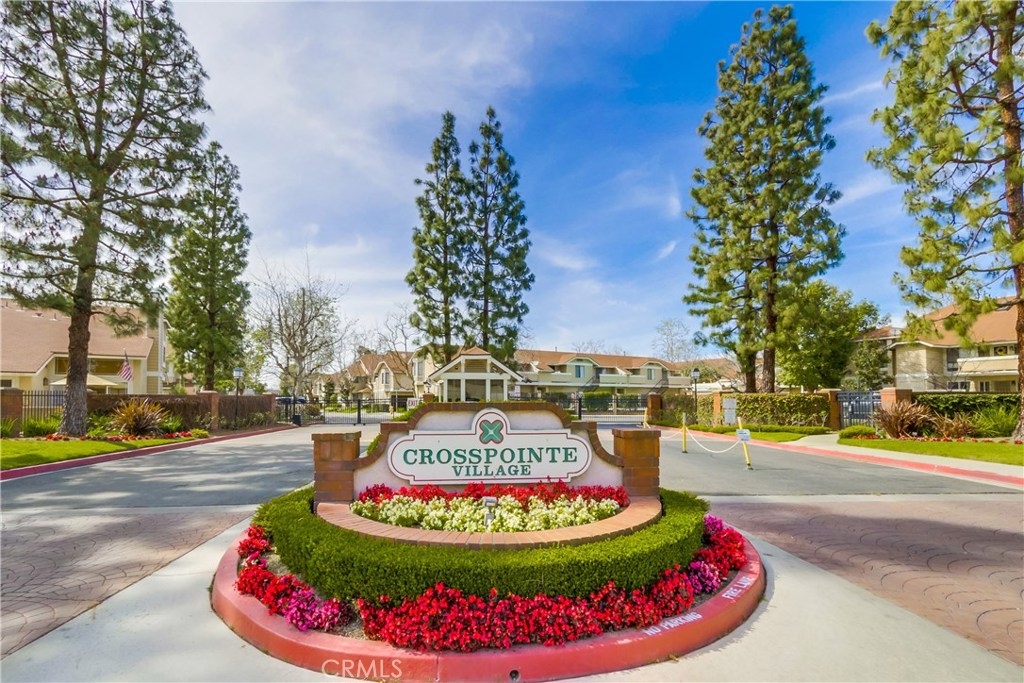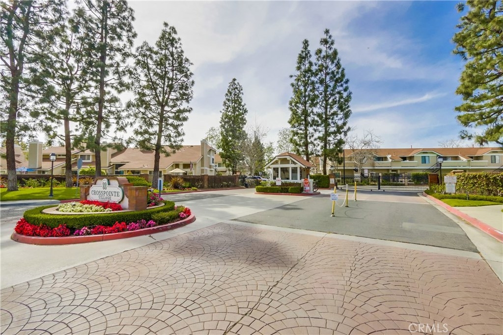 This adorable and spacious condo is located in the gate guarded community of Crosspont Village. Just off the 22 freeway at Beach Blvd and minutes from Bella Terra in Huntington Beach! There are 2 bedrooms; downstairs bedroom makes a great office, upstairs is the large loft with 1/2 bath, walk in closet and cathedral ceilings with skylights. This makes a perfect master suite and is nice and private. Lots of windows throughout with plantation shutters make it so bright inside. Kitchen has newer appliances, canned lighting, glass paneled doors on uppers and opens to dining room and living room. There is a full bath downstairs, a bedroom that would be a perfect office that overlooks the charming patio area and inside stacked washer and dryer. Beautiful newer hardwood floors and no popcorn ceilings! Ceiling fans in both bedrooms and 2 beautiful Pottery Barn chandaliers accent the dining room and stairway. All in a quiet, well maintained community. Pool area a close walk away. Plus convenient to walk to shops with a new coffee shop (S) going in just across the street! There is 1 assigned carport space and a second permit for the uncovered parking spaces, both just steps away. If you've not seen this lovely community, you must! It's a real jewel.