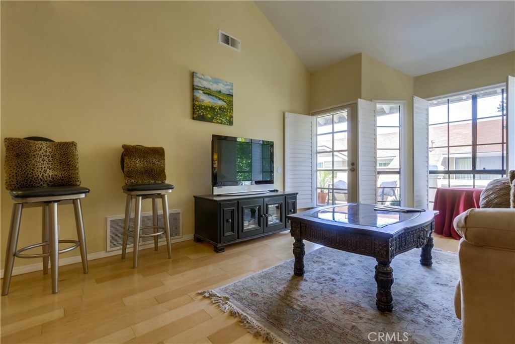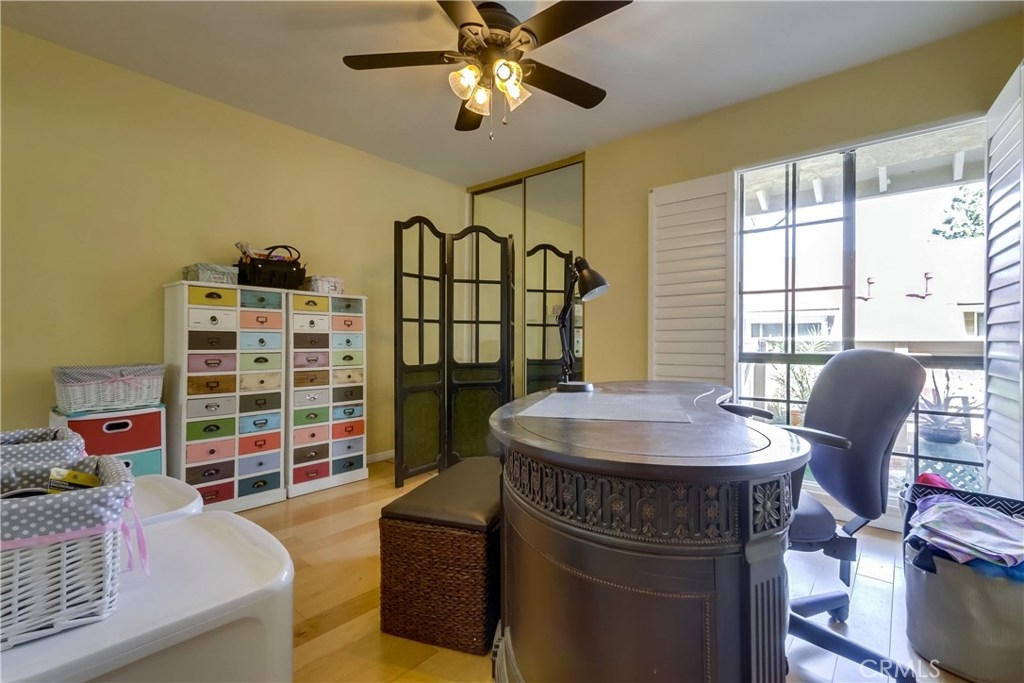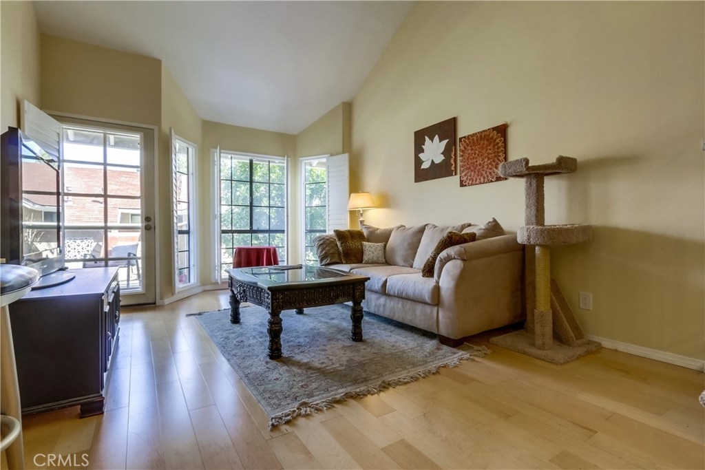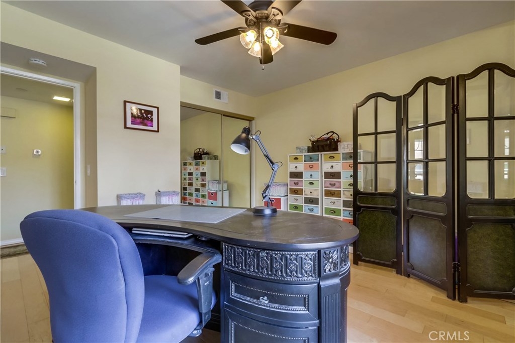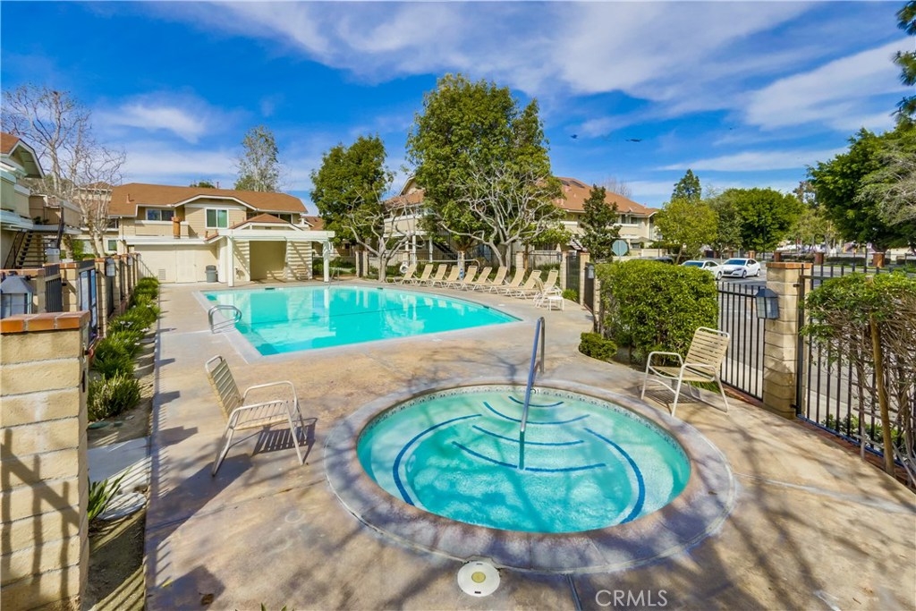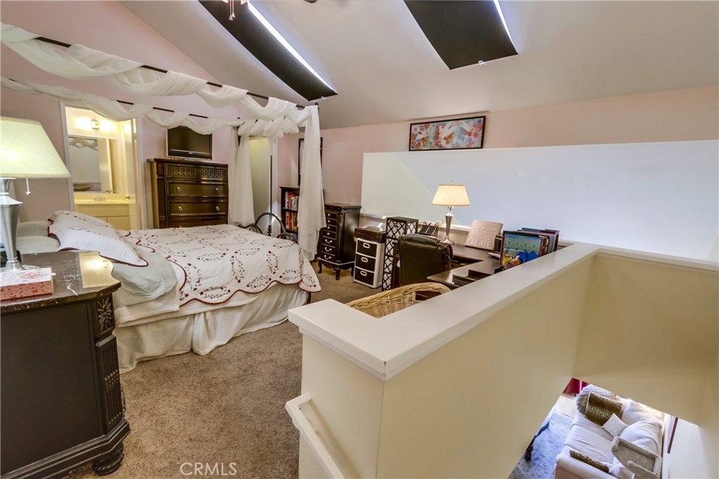 This adorable and spacious condo is located in the gate guarded community of Crosspont Village. Just off the 22 freeway at Beach Blvd and minutes from Bella Terra in Huntington Beach! There are 2 bedrooms; downstairs bedroom makes a great office, upstairs is the large loft with 1/2 bath, walk in closet and cathedral ceilings with skylights. This makes a perfect master suite and is nice and private. Lots of windows throughout with plantation shutters make it so bright inside. Kitchen has newer appliances, canned lighting, glass paneled doors on uppers and opens to dining room and living room. There is a full bath downstairs, a bedroom that would be a perfect office that overlooks the charming patio area and inside stacked washer and dryer. Beautiful newer hardwood floors and no popcorn ceilings! Ceiling fans in both bedrooms and 2 beautiful Pottery Barn chandaliers accent the dining room and stairway. All in a quiet, well maintained community. Pool area a close walk away. Plus convenient to walk to shops with a new coffee shop (S) going in just across the street! There is 1 assigned carport space and a second permit for the uncovered parking spaces, both just steps away. If you've not seen this lovely community, you must! It's a real jewel.