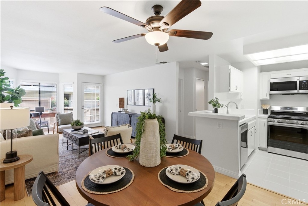 Wonderful Crosspointe Village one bedroom on the first floor. Enter through your own patio with planting pockets and plenty of room for table and chairs. Once inside there is hardwood flooring, fresh paint, textured ceilings and a bay window in the living room. The kitchen has a pantry, NEW STAINLESS APPLIANCES INCLUDING: REFRIGERATOR, MICROWAVE, GAS RANGE/OVEN AND DISHWASHER. The bedroom features 2 mirrored wardrobe closets, ceiling fan, fresh paint and a window overlooking the patio. The dining area between the kitchen and living space has a ceiling fan and nice double wide storage closet. There is Central Air and heat. Carport with storage is just one building away! The complex is gated with attendant 24/7 at the North Gate. There are 3 pool, 3 spas, lots of walking paths and a large greenbelt with a gazebo just a building away. The community is located right behind the Rodeo 39 Shopping Center with dining, banking, gym & much more.