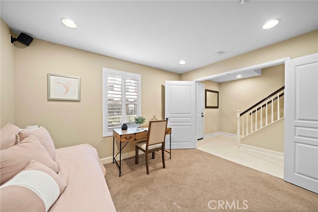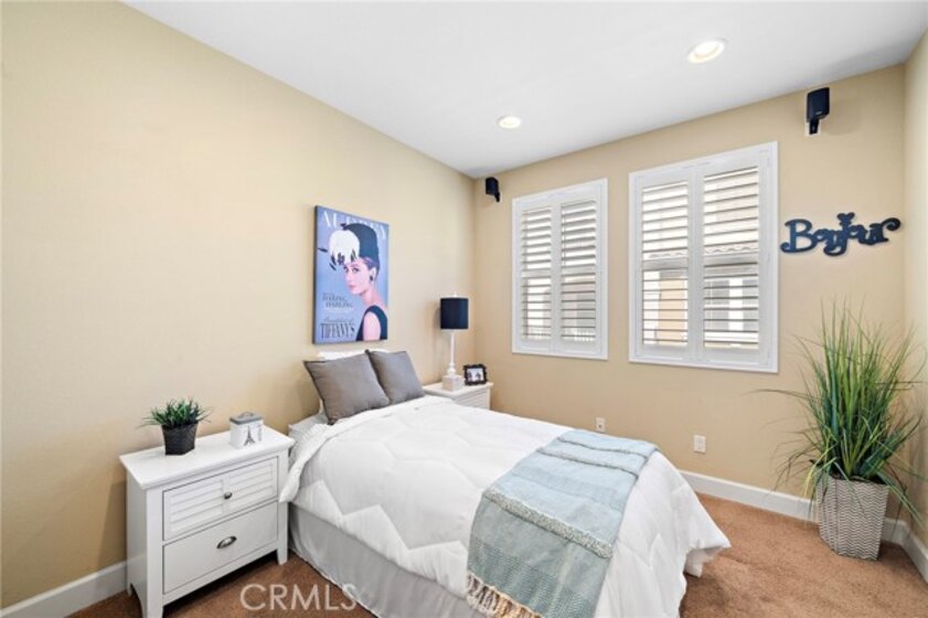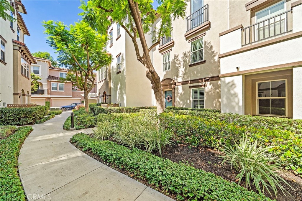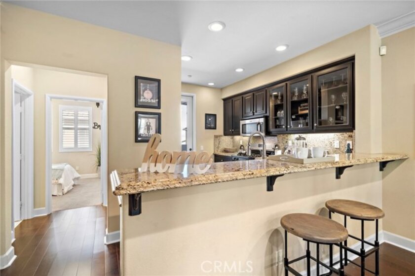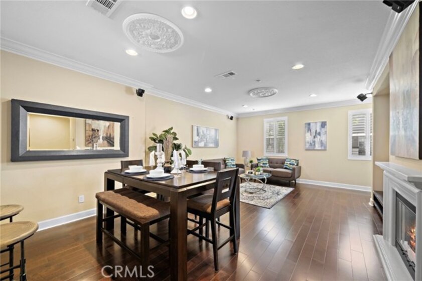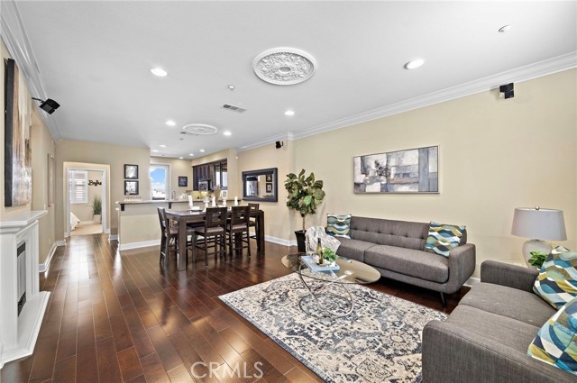 Absolutely stunning tri-level townhome-style condo quality-built by Taylor Woodrow in 2007, nestled in the exclusive Palazzo community within Renaissance Plaza with resort-style association pool, spa, and beautifully landscaped grounds, this contemporary beauty boasts 4 bedrooms, 4 full bathrooms, and 1,814 square feet and has been beautifully upgraded with modern luxury finishes throughout including central A/C, volume ceilings, crown molding, dual pane windows, plantation shutters, clear-glass French doors, raised panel interior doors and closet doors, LED recessed lighting, wide-plank wood laminate flooring, and full surround-sound wiring; the remodeled chef’s dream kitchen is a masterpiece with granite countertops, full granite backsplash, rich dark-wood soft-closing cabinetry with glass display panels and under-cabinet lighting, stainless double sinks, and stainless appliances including a gas range, dishwasher, and microwave, plus a breakfast bar open to the elegant living room with fireplace, media niche, and dining area, with a French door leading to a private second-level patio perfect for evening barbeques and dining; the bathrooms showcase Carrera marble-look countertops, upgraded lighting, tile finishes, and clear-glass enclosures, with dual sinks in the primary suite, while an ensuite bedroom on the first floor, inside laundry room, and direct-access 2-car garage plus an additional guest parking provide comfort and convenience; ideally located in the vibrant heart of Stanton, close to shopping, dining, parks, and schools with quick access to the 5, 22, and 91 freeways, offering the perfect combination of modern living, convenience, and effortless accessibility.
