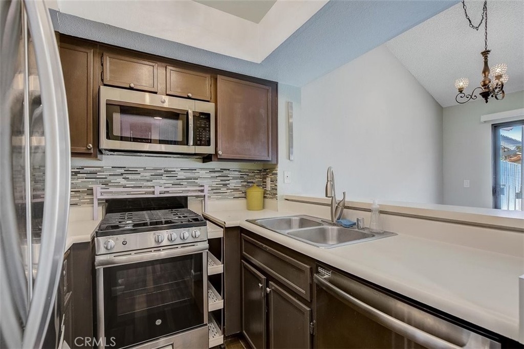 A beautiful home in Cerritos is ready for its new owners! Enter into the open and spacious living room with high ceilings, upgraded flooring, modern color tones, and a cozy fireplace. The living rooms open with large sliding doors to the spacious patio and backyard which is perfect for entertaining. The kitchen flows seamlessly from the living room and impresses with stainless steel appliances, rich dark cabinetry, and plenty of storage space. There is a half bathroom downstairs which is perfect for guest use. Up the beautiful staircase, you will find the spacious primary bedroom and the primary bathroom en suite. This beautiful room has high ceilings, a ceiling fan, carpet, and the bathroom en suite have a shower over a tub and a modern vanity. There is another spacious bedroom upstairs with a step-out balcony that has views of the neighborhood. An additional full bathroom completes the second floor. This home also has a two-door attached garage which is convenient for parking and storage. There are also 7 guest spots for the community that can be used for short-term guests. Close to shopping, dining, and many community amenities. This is the gem you have been waiting for!
