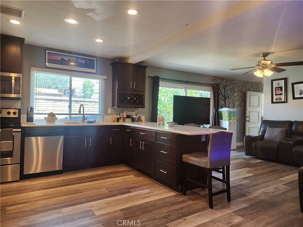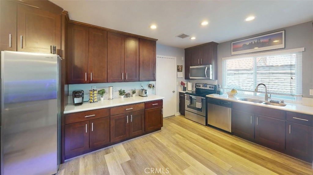Welcome home!!! Rarely offered on the market!! "SummerTree Stanton Community"! Charming corner end unit light & bright 4 bedroom, 2 bathroom, 2 car garage Townhome. This property features "Owned Solar Power", a large spacious downstairs master bedroom and bathroom. Spacious living room which is open to the dining area and kitchen. Featuring upgraded Stainless steel appliances, wine fridge, wine rack and lots of cabinet and Quartz counter space. Upstairs you will find 3 more bedrooms and an upgraded full bathroom. Additionally featuring direct access from the garage, Upgraded dual pane vinyl windows, Central air Conditioning and Heating, Air Scrubber w/ UV light for AC/Heater (Cleaner Air). Lastly a large spacious private patio area featuring artificial turf and a matured fig tree. Great for entertaining or to sit back relax and enjoy! This community features many amenities, Pool area, Remodeled club house, Children's playground area, lots of guest parking, and beautifully landscaped tree lined greenbelts for a park like setting. Conveniently located near neighborhood shopping center's, restaurant's and Stanton Central Park. Don't miss out on this one!
