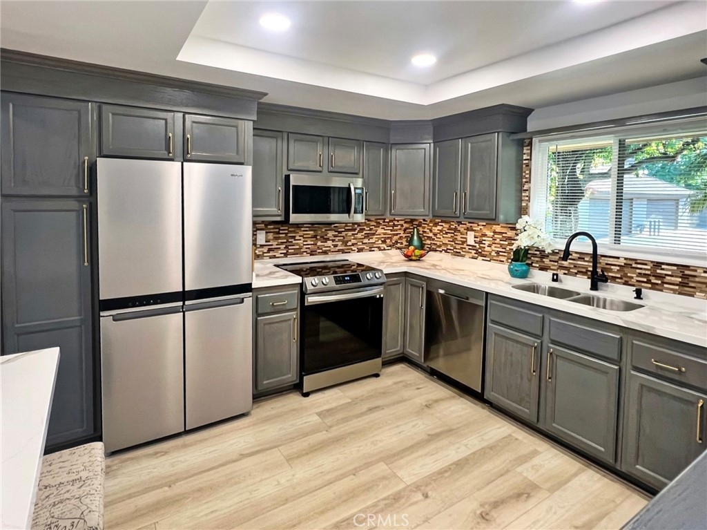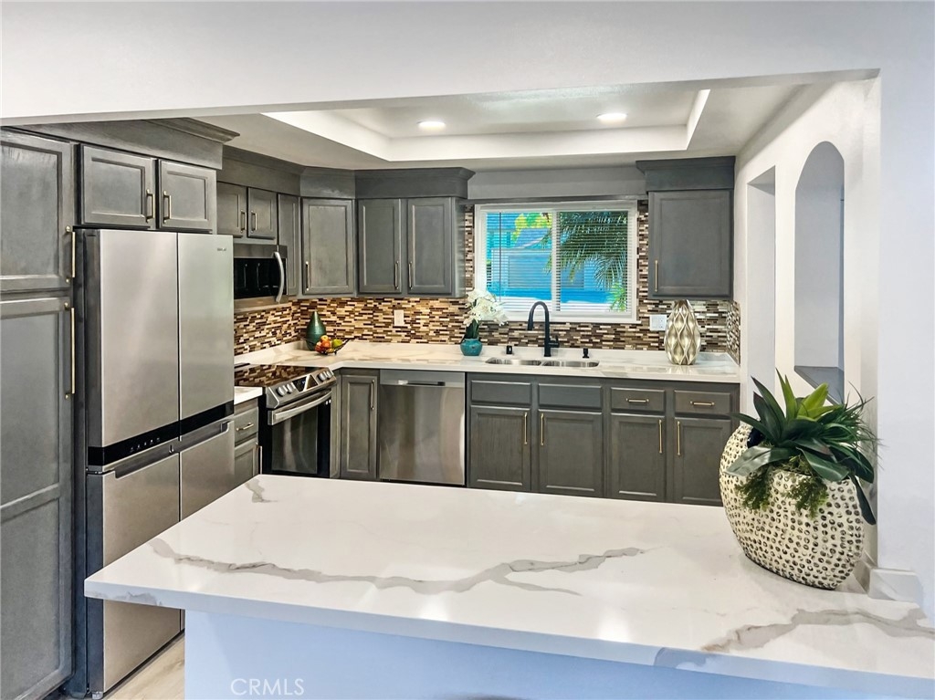 Welcome to this stunning, extensively remodeled Summertree three-bedroom townhome. Nestled in a desirable location, this home is sure to captivate buyers seeking both style and convenience. As you step inside, you'll be greeted by an inviting open floor plan that seamlessly connects the living, dining, and kitchen areas, creating an ideal space for entertaining family and friends. The newly painted interior has been thoughtfully designed with a contemporary aesthetic, boasting tasteful finishes and a neutral color palette including new laminate flooring throughout. Recessed LED lighting throughout the home. The fully renovated kitchen features sleek quartz countertops, brand-new stainless steel appliances, ample cabinetry for storage, and a convenient breakfast bar for casual dining. The primary bedroom boasts a generous walk-in closet, providing an abundance of storage, while the additional bedrooms offer versatility to be used as a home office, a cozy guest room, or a playroom for little ones. The remodeled full bathroom showcases modern fixtures, a luxurious Shower, and a chic vanity, creating a spa-like atmosphere where you can unwind and relax after a long day. Additionally, a convenient half bath adds extra convenience for residents and guests. There is a large patio with plenty of room for family gatherings and an Oversized 2 car garage. This unit Features 2 Heat pump systems, One for upstairs and one for downstairs offering efficient comfort for both Cooling and Heating. Home includes Dual Pane Vinyl Windows. Residents of this complex will have access to a range of desirable amenities, such as a well-maintained swimming pool, Clubhouse, Playground areas and beautifully landscaped communal areas and extra guest parking. Additionally, the townhome is ideally situated close to shopping centers, parks, restaurants, and excellent schools, making it an ideal location for families or individuals alike.