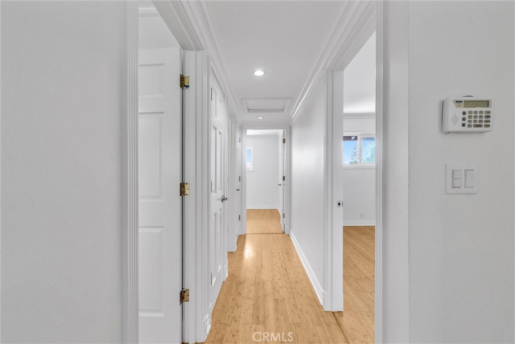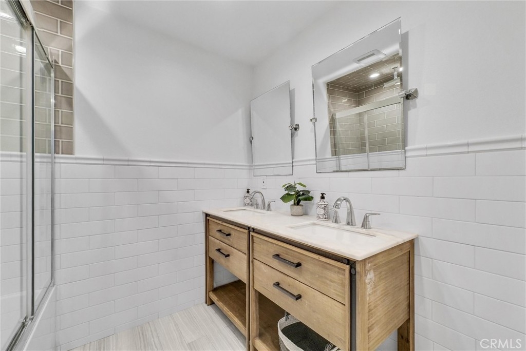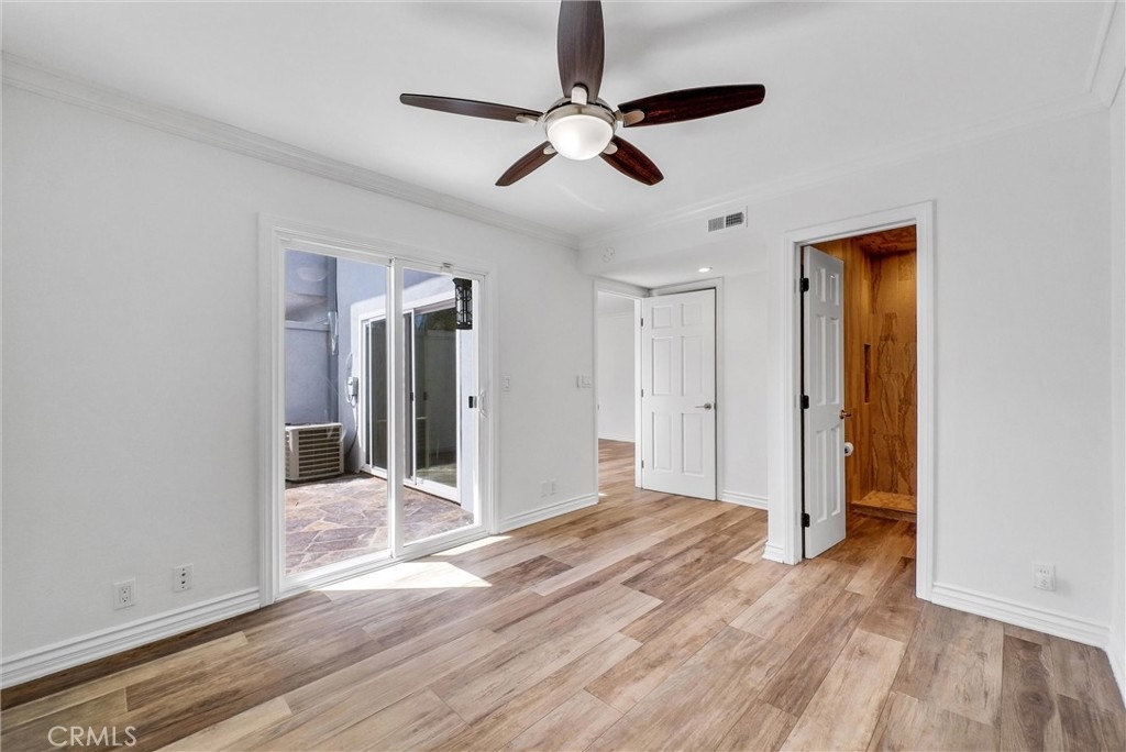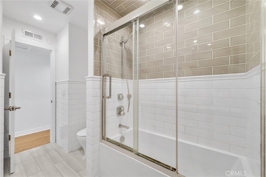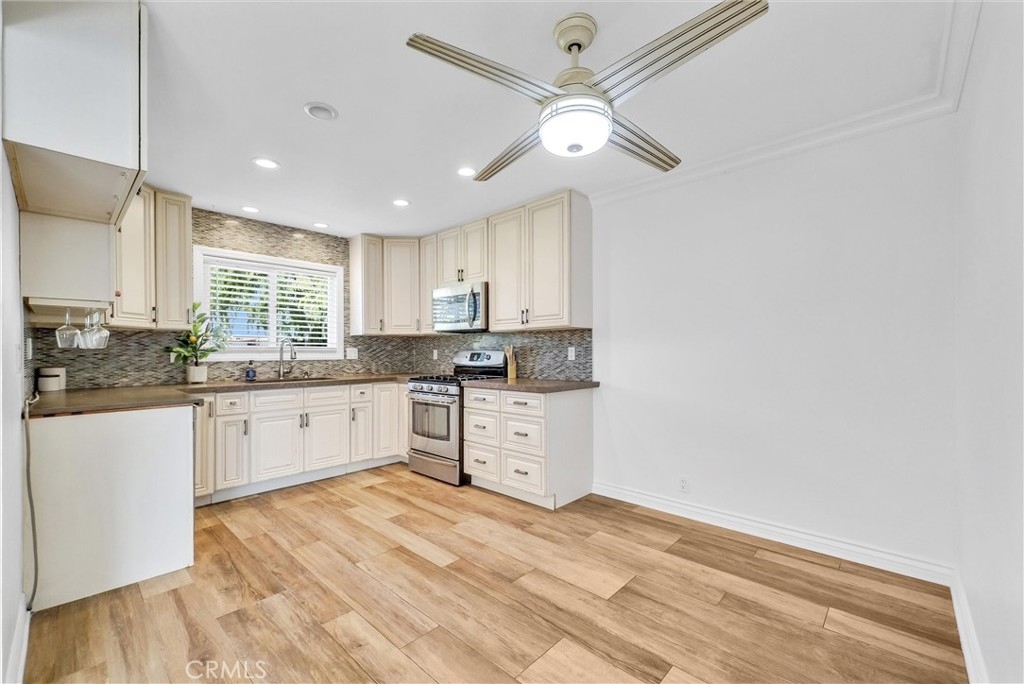This 2-story, 4 bedroom/2 bath townhome is Move-In ready and offers the perfect balance of comfort, style, and convenience for you and your family to enjoy. This home is located in the Sunshine Village community and is in a great location facing a large greenbelt. Upon entering, the home, you are greeted by a warm and inviting atmosphere with wood-like porcelain flooring and recessed lighting that flows seamlessly throughout the first floor. The updated eat-in kitchen is a chef's dream, boasting distressed-style cabinets for a touch of rustic elegance along with a tiled backsplash, stainless steel appliances, and high-quality quartz countertops with a built-in wine rack. The spacious living room opens to a private patio yard, creating an ideal indoor-outdoor living space. The adjacent Primary Bedroom features a walk-in closet, ceiling fan, and luxurious wood-like porcelain flooring, with a spa-like ensuite bathroom that includes heated flooring, a walk-in shower with dual shower heads, including a ceiling-mounted rain shower head and exquisite Peruvian Travertine-covered walls. There is also a glass slider which brings in natural light and allows direct access to the patio yard. As you walk upstairs on the wooden staircase you’ll notice the decorative wrought iron railings. There are 3 additional bedrooms with ceiling fans, wood flooring and closets with built in shelves. The upstairs bathroom has a double sink vanity with plenty of storage and a large tub/shower combo with glass sliding doors and porcelain flooring. Outside, the private patio yard is perfect for entertaining, featuring slate flooring and plenty of room to relax and unwind. Convenient access to the private laundry room from the patio yard makes chores a breeze, with additional perks including washer/dryer hookups, a tankless water heater, and a water softening system. The patio yard also provides direct access to the private 2-car garage. This home is equipped with central air conditioning and heating for year-round comfort. The Sunshine Village community amenities include a clubhouse, swimming pool, tennis courts, basketball courts, and lush greenbelts throughout. Home is centrally located near shopping, dining, schools, parks, public transportation, and freeways. Don't miss your chance to make this home your own!