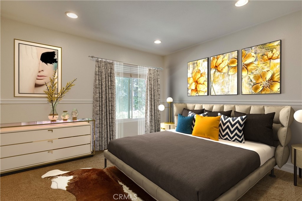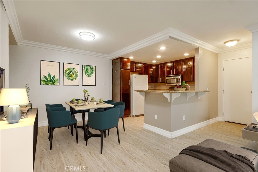 Welcome to this amazing home in the City of Stanton. Downstairs single story home with 2 bedrooms and 2 bathrooms along with an attached single car garage with direct access and one parking space belong to the unit. Located in the well desired Briar Oaks Gated Community. Entering the unit to an expansive living room connected conveniently to the dining area and the kitchen. Central air conditioning and heating, new hardwood flooring & carpets add value to the home. Ample cabinet spaces within the kitchen for extra storage along with a separate storage area for convenience. A separate Washer and Dryer area is located in the hallway for easy chores. The spacious master bedroom is connected to the master bathroom. The covered patio area is accessible via the living room. This community features a swimming pool and spa and lots of guest parking. Conveniently located near familiar restaurants, shopping centers, and Stanton Central Park. Don't miss this great opportunity! FHA approved Community The Inside condo Photos Virtually staged