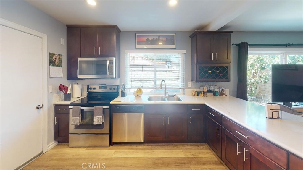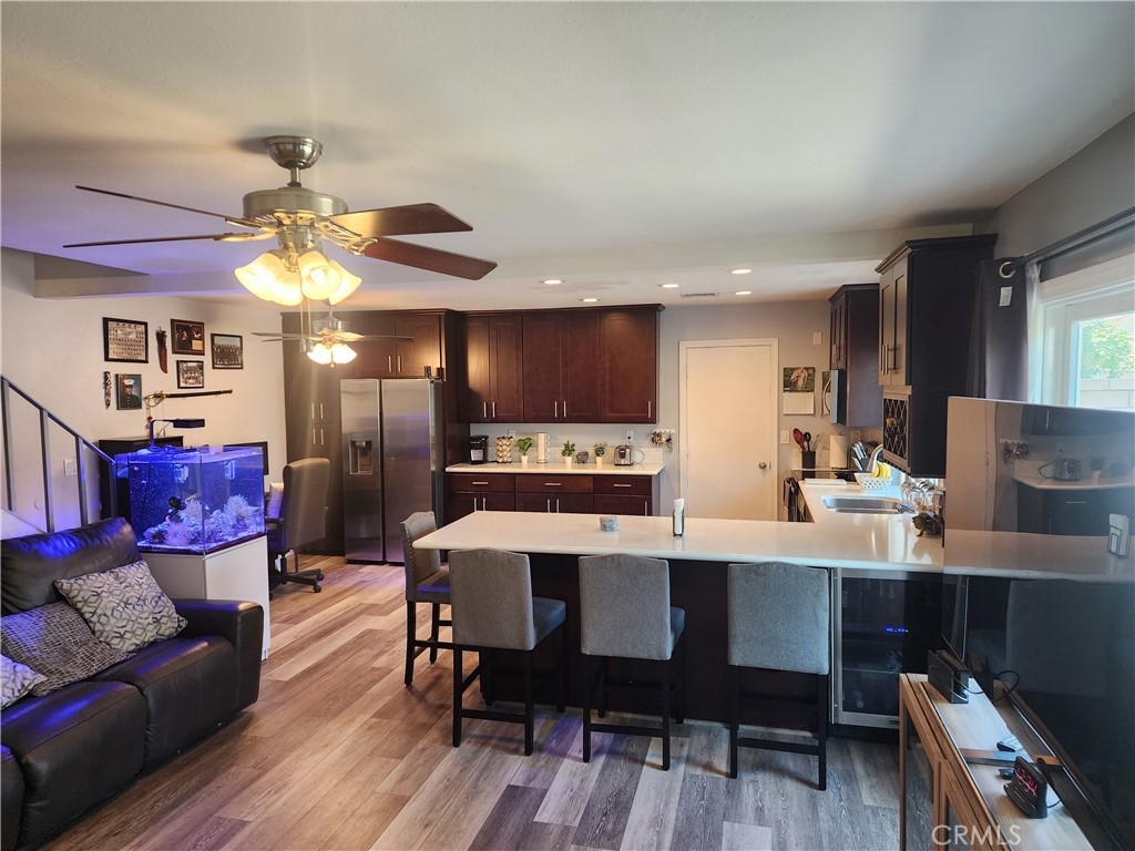 Welcome home!!! Rarely offered on the market!! "SummerTree Stanton Community"! Charming corner end unit light & bright 4 bedroom, 2 bathroom, 2 car garage Townhome. This property features "Owned Solar Power", a large spacious downstairs master bedroom and bathroom. Spacious living room which is open to the dining area and kitchen. Featuring upgraded Stainless steel appliances, wine fridge, wine rack and lots of cabinet and Quartz counter space. Upstairs you will find 3 more bedrooms and an upgraded full bathroom. Additionally featuring direct access from the garage, Upgraded dual pane vinyl windows, Central air Conditioning and Heating, Air Scrubber w/ UV light for AC/Heater (Cleaner Air). Lastly a large spacious private patio area featuring artificial turf and a matured fig tree. Great for entertaining or to sit back relax and enjoy! This community features many amenities, Pool area, Remodeled club house, Children's playground area, lots of guest parking, and beautifully landscaped tree lined greenbelts for a park like setting. Conveniently located near neighborhood shopping center's, restaurant's and Stanton Central Park. Don't miss out on this one!