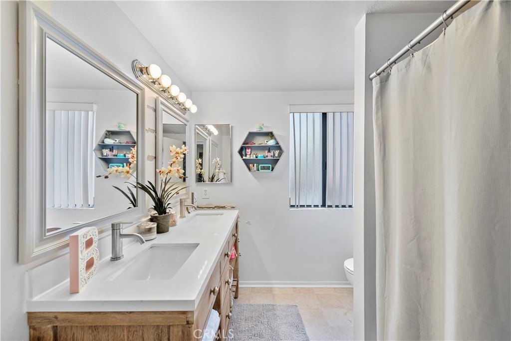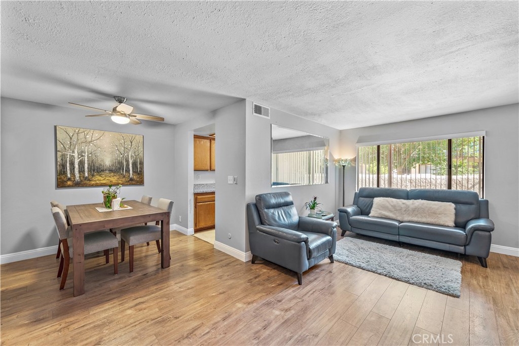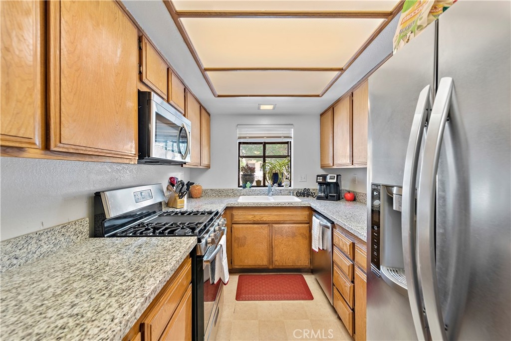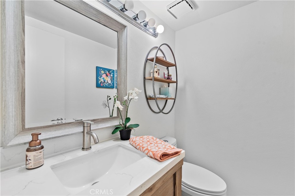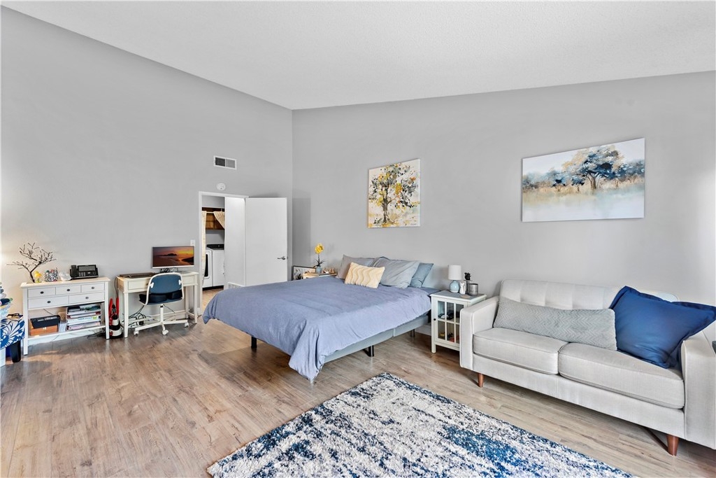 This is the ONE! This beautiful condo in the Bell Terrace community has a lot to offer. The downstairs living space is spacious and has been recently remodeled with fresh paint, an upgraded brick fireplace, and new flooring. The kitchen has granite counters, newer stainless steel appliances, and upgraded fixtures. The downstairs half bath has also been upgraded with a new vanity and mirror. Upstairs boasts two enormous bedrooms and two recently remodeled bathrooms. The master bedroom has a large closet area perfect for a big wardrobe. Laundry area is conveniently located upstairs. This home also has two private outdoor areas; the front, enclosed patio area with room for outdoor living furniture and bar be que, and a private balcony off of the master bedroom. This property also has a large two car garage. (Not shared) The complex is very nicely maintained with lush landscaping, a sparkling pool and spa, and a security gate for extra safety. The location of this unit is fantastic. Close to schools, shopping, and restaurants. Check the map, this home is located within 5 miles of the 22, 5, 91, 605, and 405 freeways.