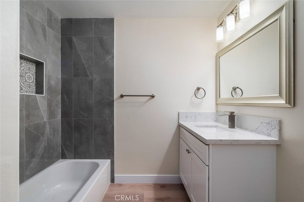 Welcome to this charming townhouse in Stanton. This upgraded home features 4 bedrooms and 2 bathrooms with a detached 2-car garage. Well renovated with new laminated floor, new cabinets, new stainless appliances, new recessed lights, new light fixtures, and new custom paints. A new dishwasher, a new microwave and a new gas range will be installed and provided for the buyer. Community amenities have a sparkling pool, spa, tennis courts, clubhouse and dog park. HOA covers water and trash service. Great location closed to schools, parks, malls, and 405 freeway nearby. Unit is a PUD, so FHA & VA buyers are welcome.