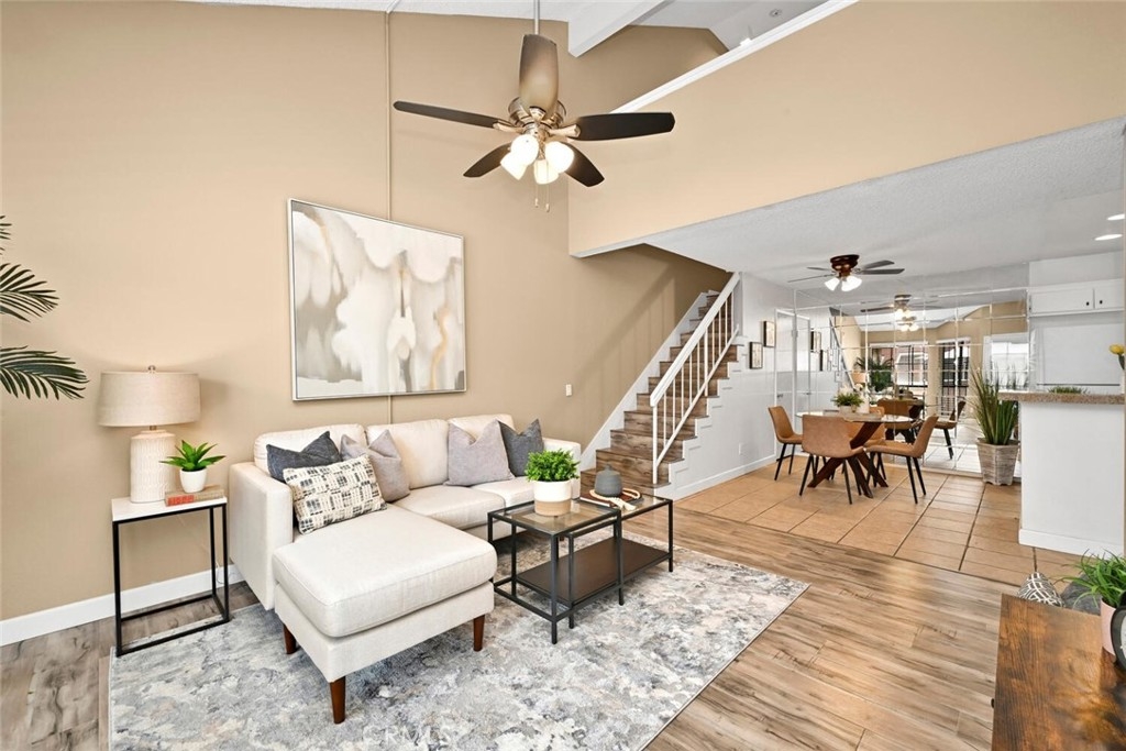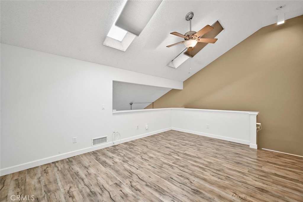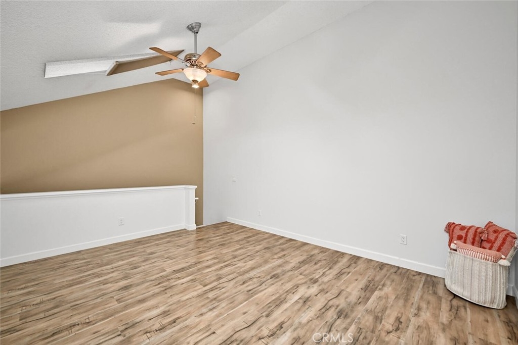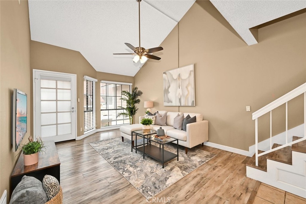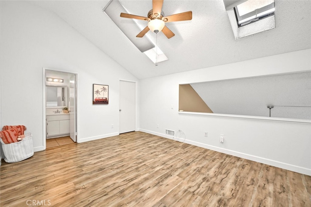 Welcome to this delightful condominium within the gated community of Crosspointe Village in Stanton. This nicely maintained, two-level home features an open floor plan with two bedrooms and one and a half bathrooms. The second bedroom is a large upstairs loft with a half bathroom and a large walk-in closet. As you enter, you'll be greeted by the inviting living space with vaulted ceilings, new paint, ceiling fans, and laminate flooring, creating a spacious and comfortable living area. This well-designed condominium offers plenty of storage space, making organization a breeze. The upstairs bedroom/loft is a versatile space with a private half bathroom, a walk-in closet, and skylights, allowing natural light to illuminate the room. The laminate flooring throughout adds a touch of warmth and durability. Crosspointe Village provides an array of amenities for residents to enjoy. Dip in one of the three pools or relax in one of the spas. The greenbelt areas provide a peaceful setting for leisurely walks. The community also offers 24-hour security at the gate, ensuring safety and peace of mind. Convenience is a highlight of this condominium, with the assigned covered carport No. 775 just a few feet from the unit. Additionally, the location is ideal, with easy access to freeways, shopping centers, and the new Rodeo 39 Public Market, offering various dining and entertainment options.