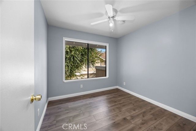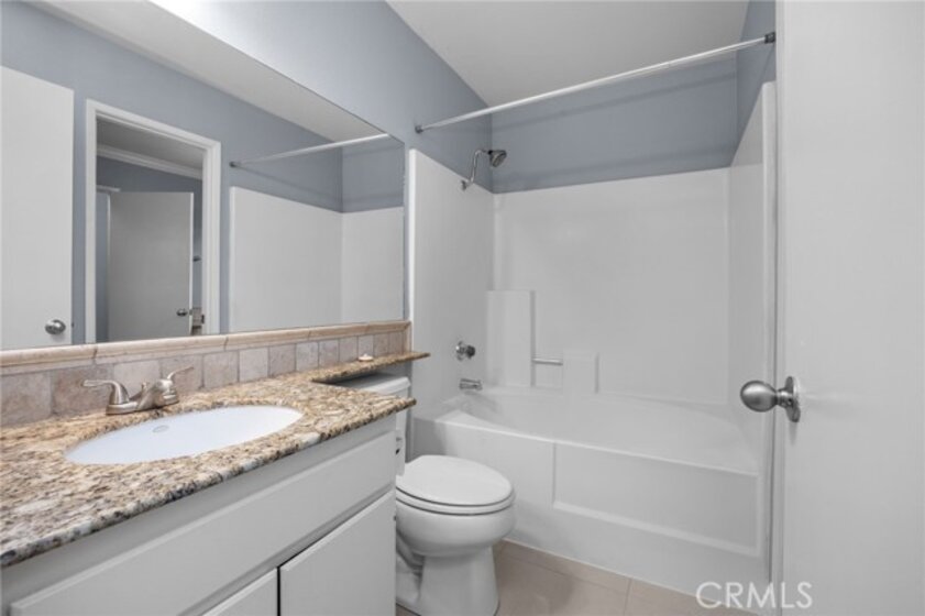 A charming 2 bedroom 1 bath condominium located in Stanton inside the gated community of Crosspoint Village. The condo is located further in from the Boulevard and streets and offers a much quieter location. The condo is has vaulted ceilings, laminate flooring and recently painted inside. This a great quiet and peaceful community with HOA amenities including several pools, spa, hot tubs and a green belt and lots of trees around the community. The home is on the second floor with a large master bedroom with a walk in closet and a large vanity next to the bathroom. There is a large landing at the entrance of the home.