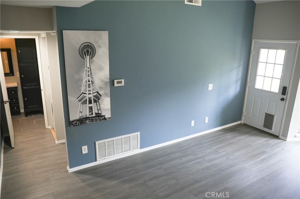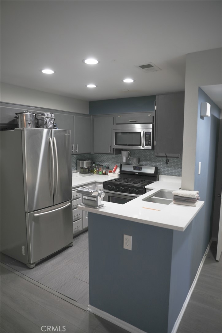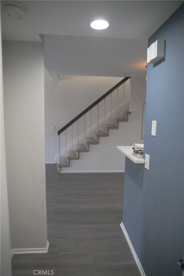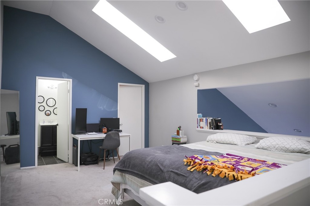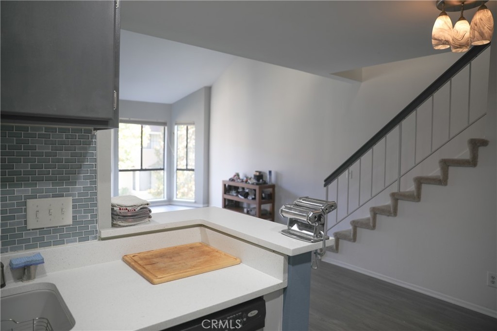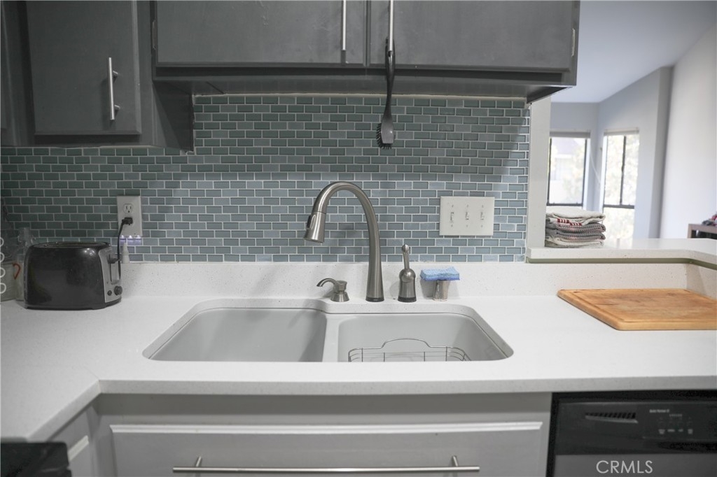 Welcome to this beautiful upstairs corner unit located at Crosspointe Village, Stanton. This 2 story unit is a 2 bedroom Loft style with walk-in closet upstairs and two large skylights providing natural light. There is a half bath upstairs, a full bath downstairs. Upgraded kitchen boasts beautiful Quartz counter tops, painted cabinetry, subway tile back-splash and stainless steel appliances. Living room has high vaulted ceiling and large picture windows, creating a very grand and spacious feel. New laminate wood flooring in Living room is less than one year old. Parking is nearby, carport number 569 with individual storage unit. Come and experience this well maintained Community with 24 hour gate attendant for exclusive security, 3 pools, 3 spas, and many walking paths throughout. Great location, easy fwy access as well as newer shopping center close by.