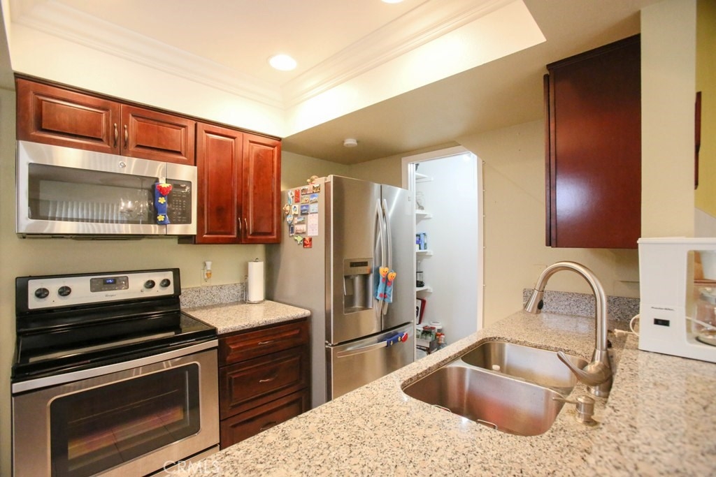 Very beautiful remodeled townhouse with single family style : 2 entrances back and front. Bright and clean house with 2 levels with 3 bedrooms upstairs. 2 car garage attached and lots of parking spaces on street. All remodeled with LED recessed ceiling lights, wood color laminate floor, kitchen granite counter top with breakfast bar counter. Central Heat . Sale price includes washer and dryer and the fridge. Walking to common pool. Minutes to freeway, shopping center.