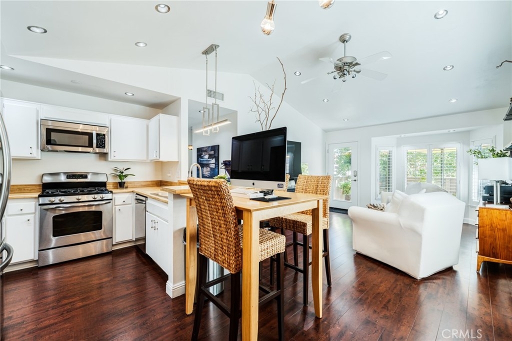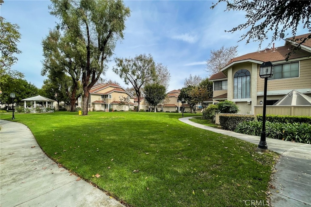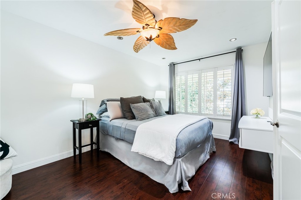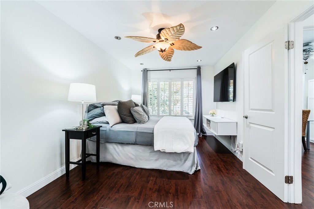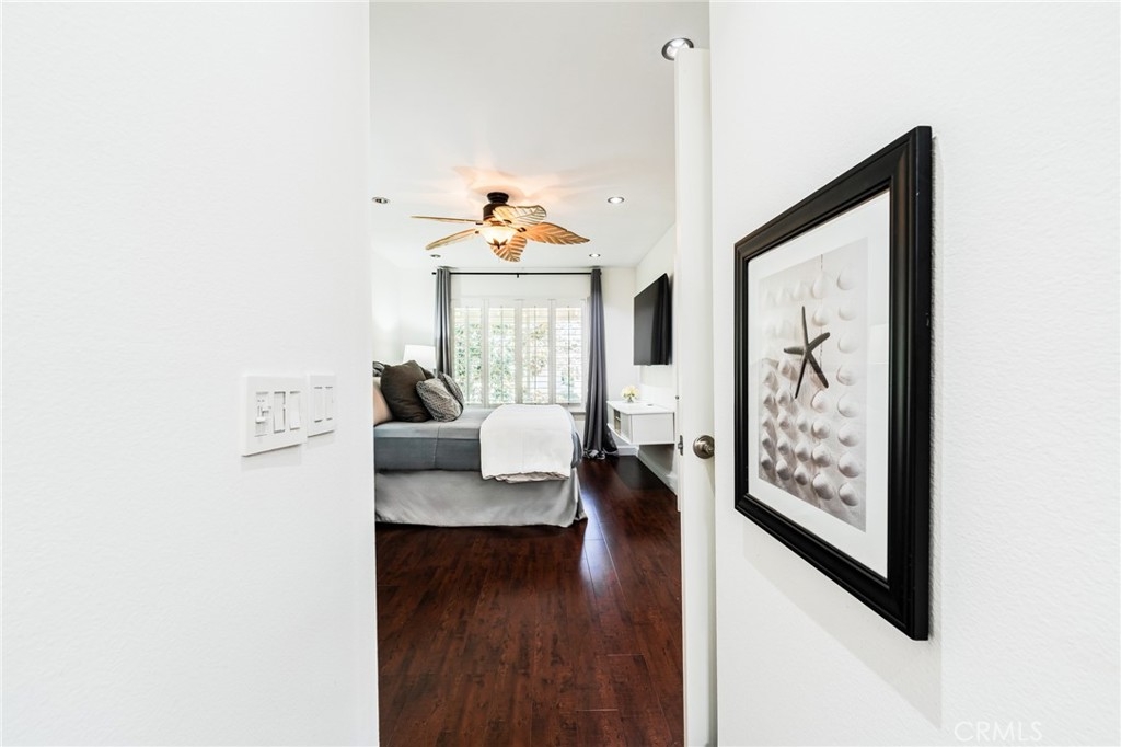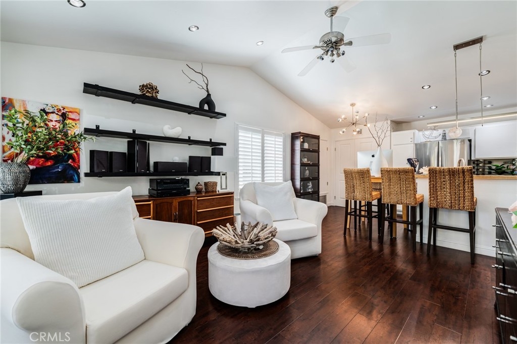 Turnkey Stanton home in the desirable CrossPointe Village Community! This community has a 24 hour security guard, it also boast 3 community pools and spas! Great entertainment for families in the Summer months! This Gorgeous end unit, offers 2 bedrooms and 1 bathroom. This open floor plan is ideal for entertaining and 1st time home buyers! The plan has cathedral ceilings, modern light fixtures, 4 inch baseboards, laminate flooring, recessed lighting, shutters throughout and ceiling fans in each room. The second bedroom can be used as an office or cozy loft area, perfect for reading. This home is conveniently located close to award winning schools, plenty of shopping and dining options, and only minutes away from the 22, 55 and 405 freeways. This property wont last!