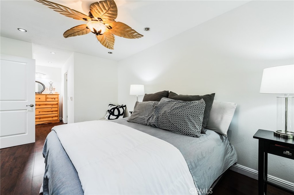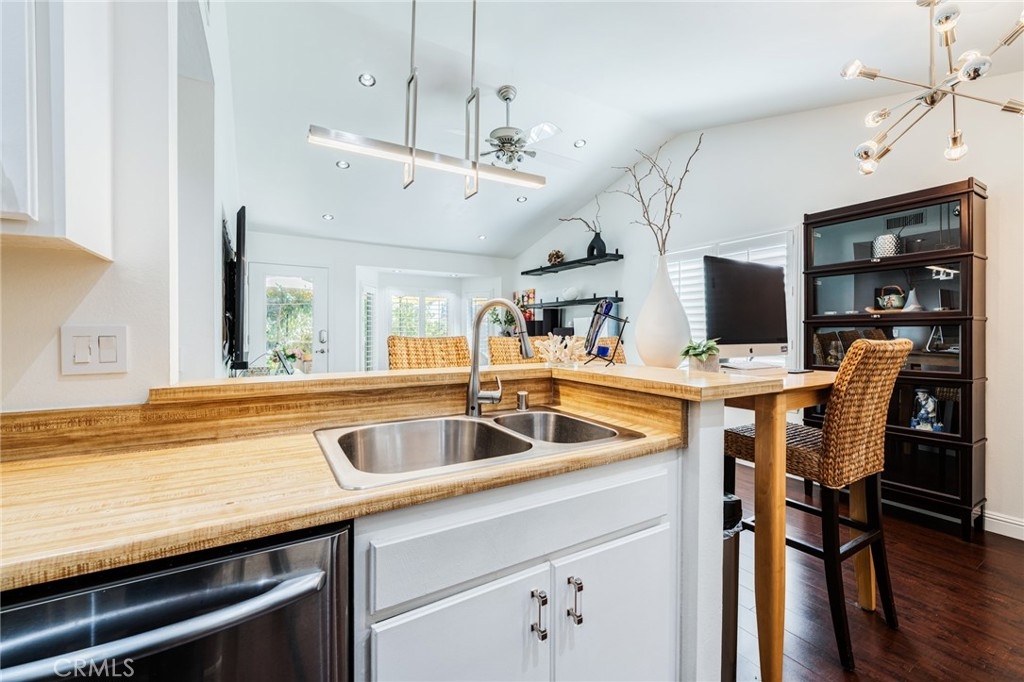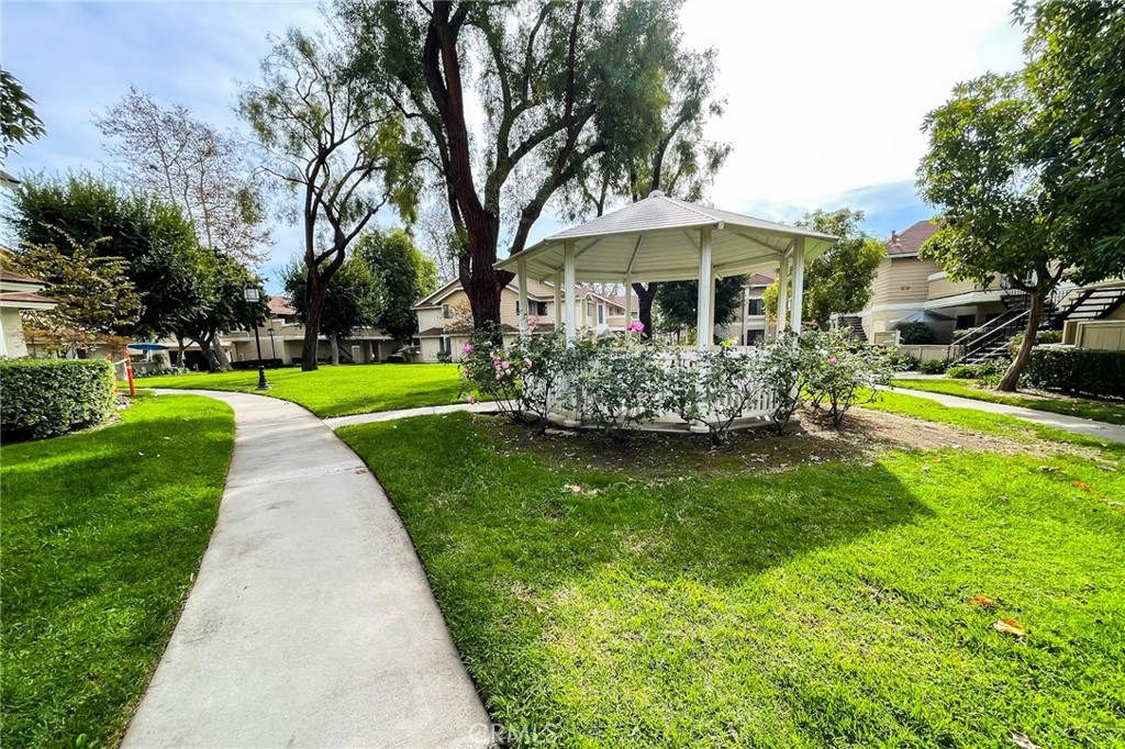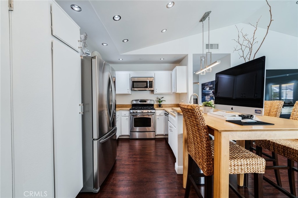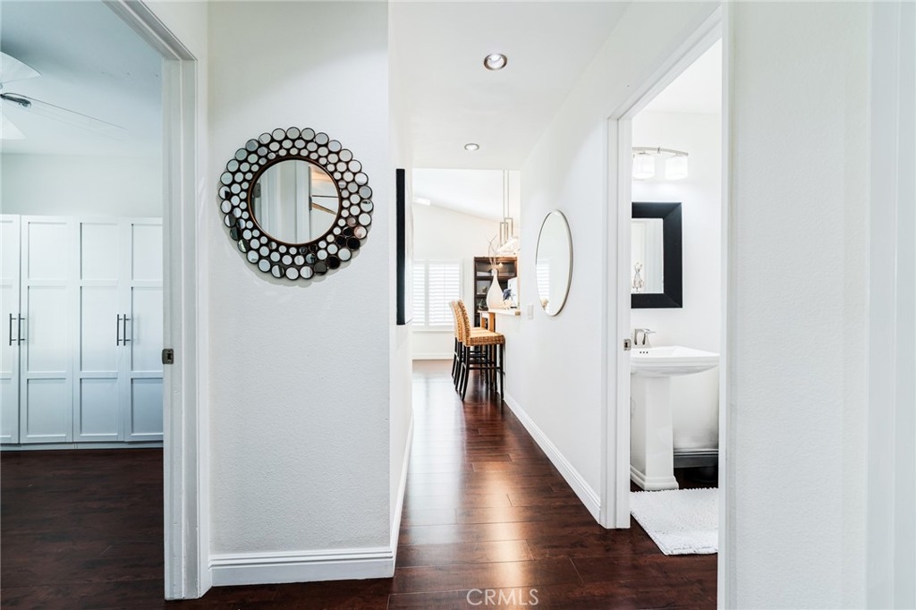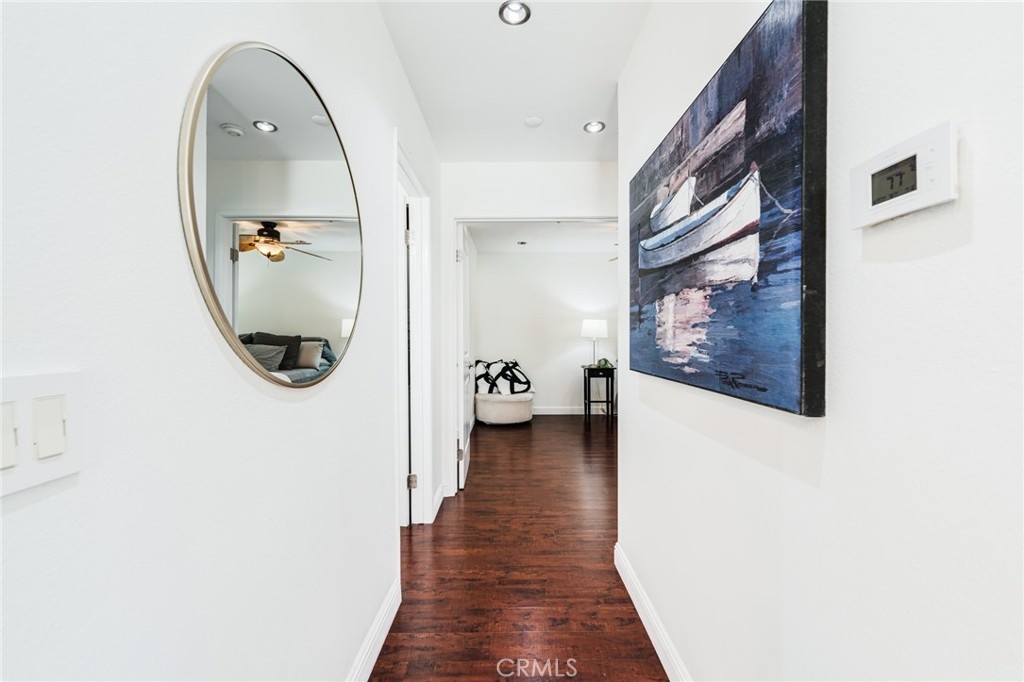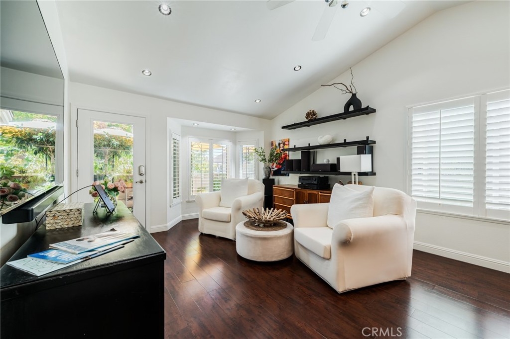 Turnkey Stanton home in the desirable CrossPointe Village Community! This community has a 24 hour security guard, it also boast 3 community pools and spas! Great entertainment for families in the Summer months! This Gorgeous end unit, offers 2 bedrooms and 1 bathroom. This open floor plan is ideal for entertaining and 1st time home buyers! The plan has cathedral ceilings, modern light fixtures, 4 inch baseboards, laminate flooring, recessed lighting, shutters throughout and ceiling fans in each room. The second bedroom can be used as an office or cozy loft area, perfect for reading. This home is conveniently located close to award winning schools, plenty of shopping and dining options, and only minutes away from the 22, 55 and 405 freeways. This property wont last!