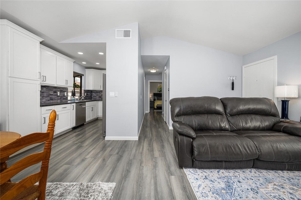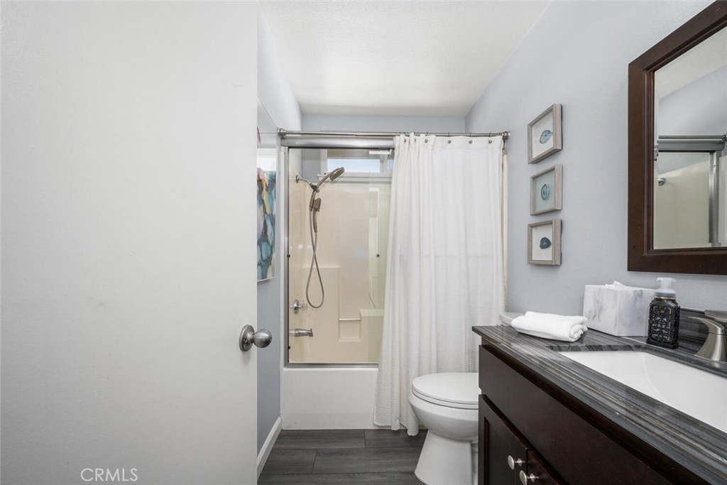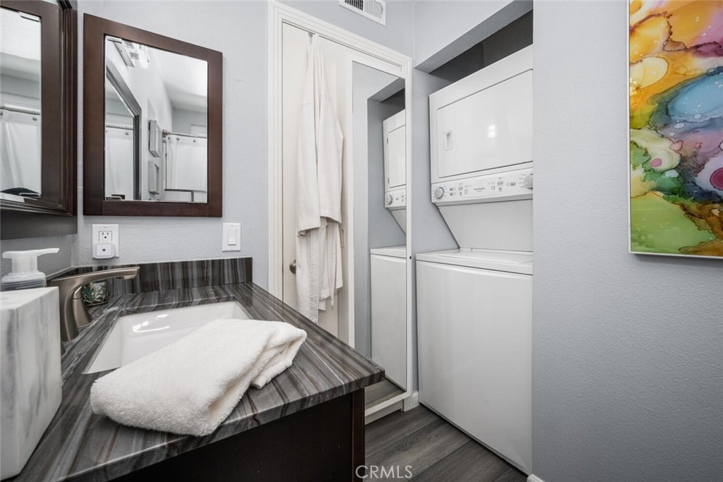 Beautifully upgraded top-floor corner unit in the gated community of Crosspointe Village. Ideally situated directly above its assigned parking space, this pristine condo offers privacy, convenience, and true turnkey living. Completely remodeled throughout, the home features brand-new kitchen cabinetry, modern countertops, stainless steel appliances, and a convenient stacked washer and dryer. Both bathrooms have been tastefully updated, and the water heater was replaced in 2025 for added peace of mind. Upgraded interior paint, newer flooring, dual-pane windows, and a sliding glass door enhance comfort and energy efficiency. The spacious primary suite includes an en-suite bathroom and large dual closets. Step out onto your private balcony with additional storage. The secondary bedroom is thoughtfully designed with a built-in Murphy bed, desk, and storage, making it ideal for guests or a home office. Located in Stanton, just minutes from shopping, dining, and convenient freeway access. Residents of Crosspointe Village enjoy 24-hour guard service, controlled access, and resort-style amenities, including swimming pools and spas, creating a secure and welcoming community.