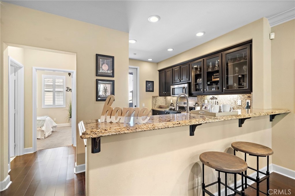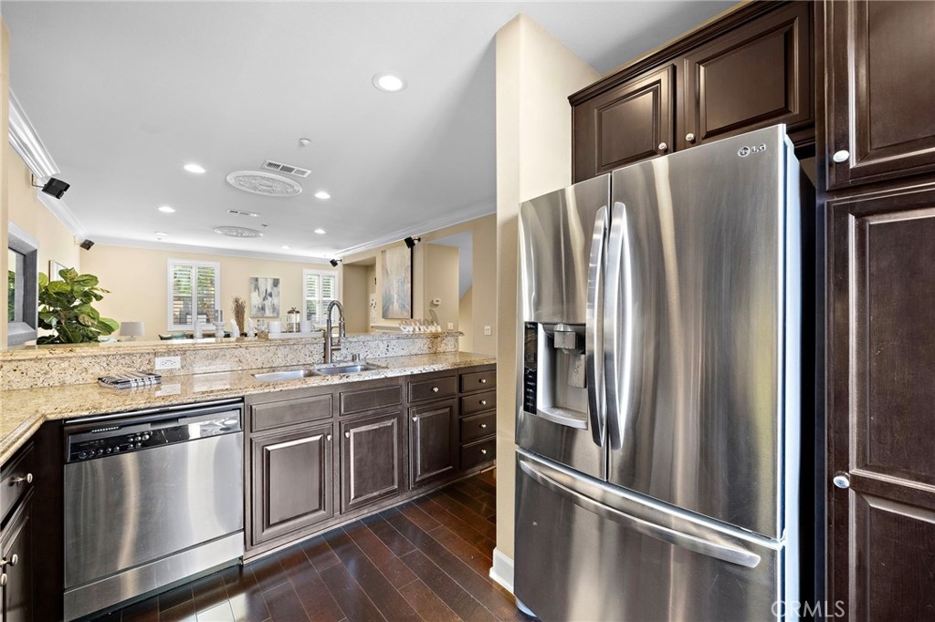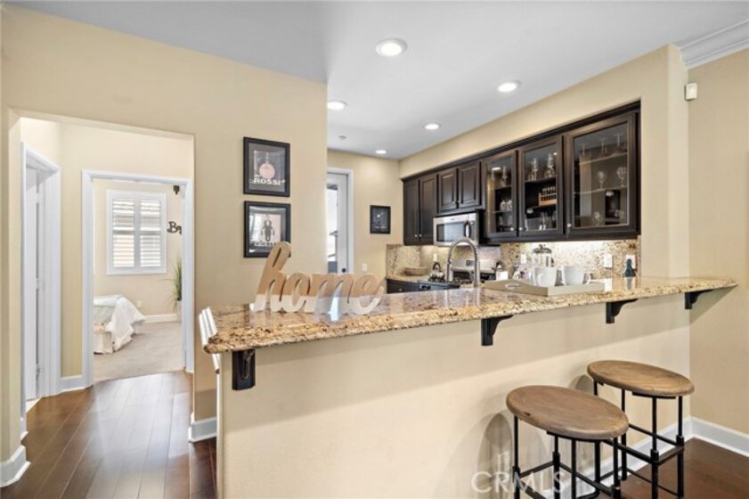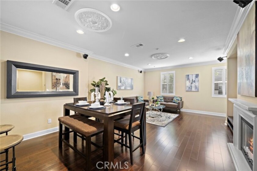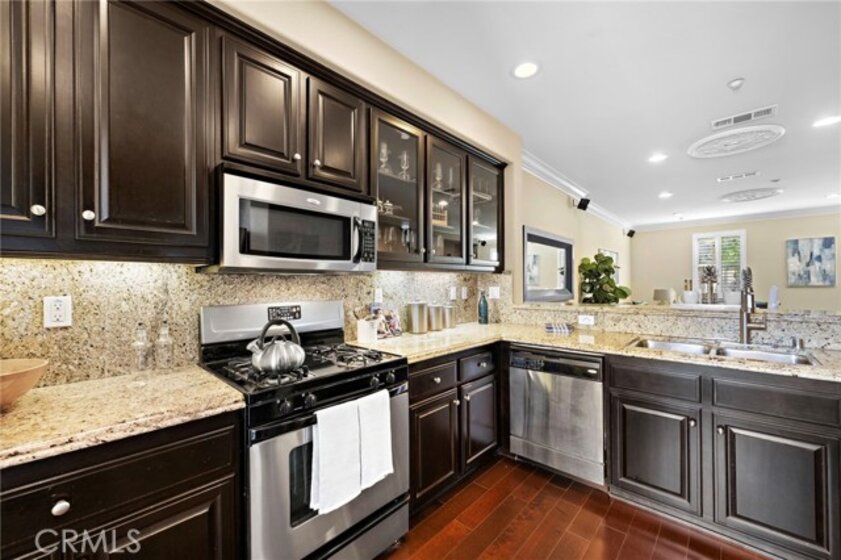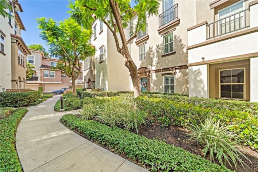 Absolutely stunning tri-level townhome-style condo, quality-built by Taylor Woodrow in 2007, featuring 4 spacious bedrooms—three with private ensuite bathrooms, including an elegant primary suite. Nestled in the exclusive Palazzo community within Renaissance Plaza, this contemporary home offers 4 full bathrooms, 1,814 square feet of thoughtfully designed living space, and resort-style amenities including a pool, spa, and lushly landscaped grounds. This home has been beautifully upgraded with modern luxury finishes throughout including central A/C, volume ceilings, crown molding, dual pane windows, plantation shutters, clear-glass French doors, raised panel interior doors and closet doors, LED recessed lighting, wide-plank wood laminate flooring, and full surround-sound wiring; the remodeled chef’s dream kitchen is a masterpiece with granite countertops, full granite backsplash, rich dark-wood soft-closing cabinetry with glass display panels and under-cabinet lighting, stainless double sinks, and stainless appliances including a gas range, dishwasher, and microwave, plus a breakfast bar open to the elegant living room with fireplace, media niche, and dining area, with a French door leading to a private second-level patio perfect for evening barbeques and dining; the bathrooms showcase Carrera marble-look countertops, upgraded lighting, tile finishes, and clear-glass enclosures, with dual sinks in the primary suite, while an ensuite bedroom on the first floor, inside laundry room, and direct-access 2-car garage plus an additional guest parking provide comfort and convenience; ideally located in the vibrant heart of Stanton, close to shopping, dining, parks, and schools with quick access to the 5, 22, and 91 freeways, offering the perfect combination of modern living, convenience, and effortless accessibility.