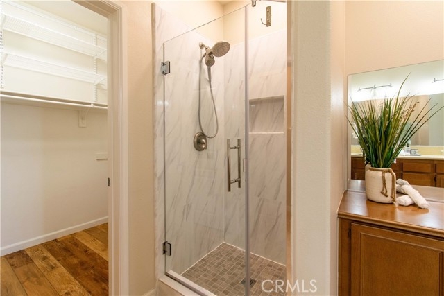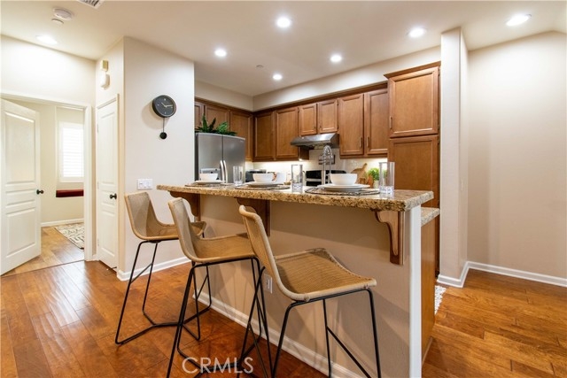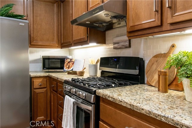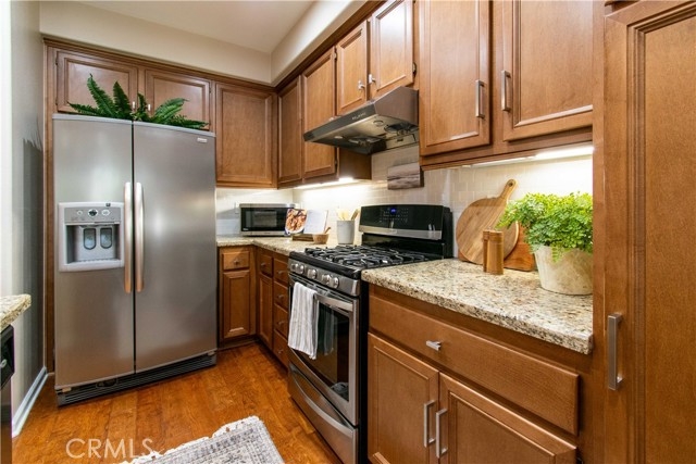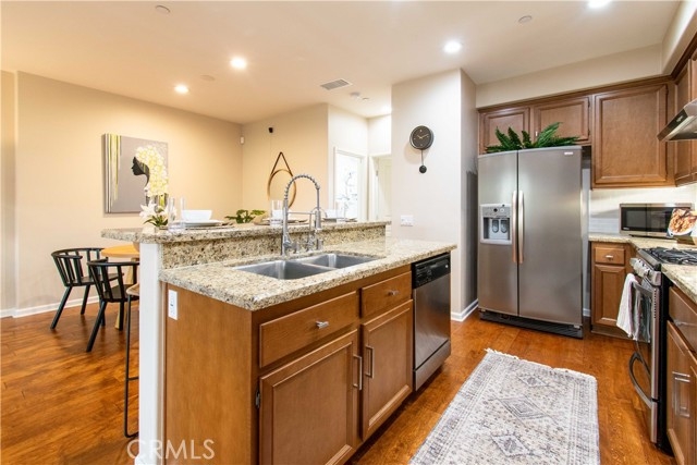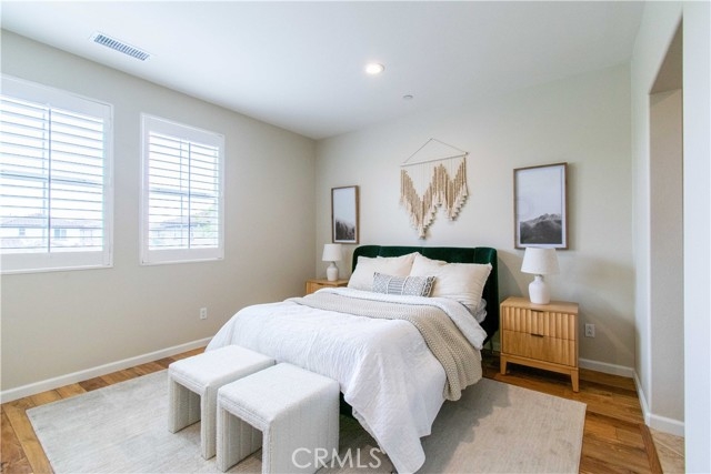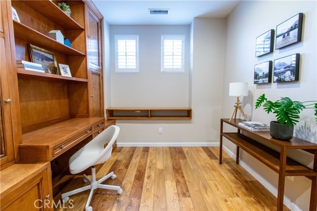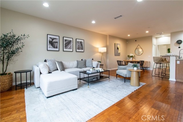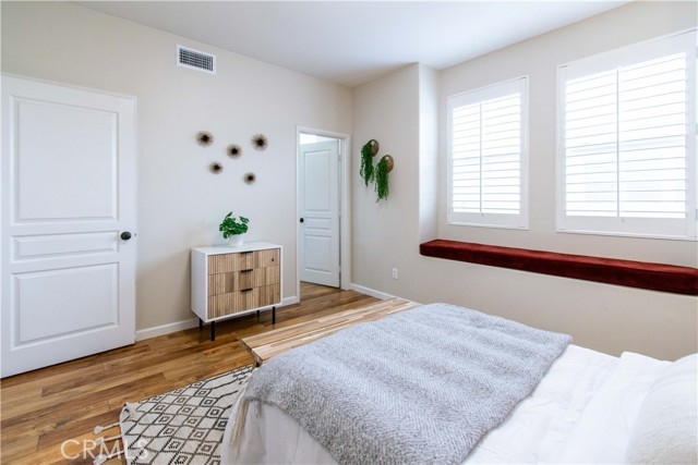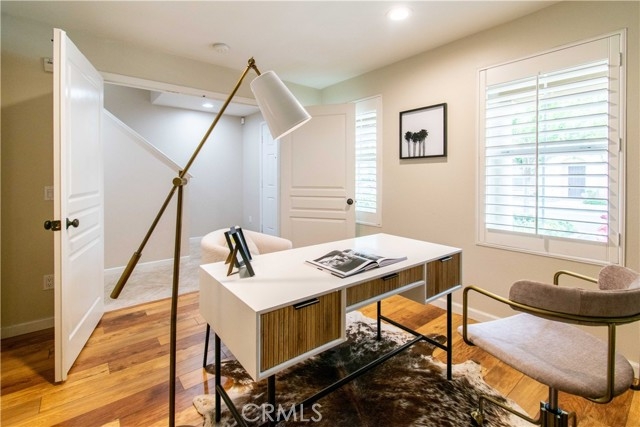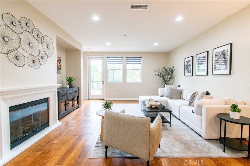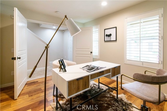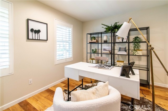 Welcome to the Palazzo, a tri-level townhome complex with Italianate architectural details completed in 2008. Extensive upgrades including brand new wood flooring throughout, remodeled bathrooms, close to new heating/cooling and Tesla car charger in the garage. The downstairs bedroom functions as an office, or could be an in-law suite with its own on-suite bathroom and closet. The second floor opens up to living, cooking, and entertaining, with lovely views off the balcony, open living space, and plenty of natural light. Kitchen has extensive cabinetry with new custom pulls, Reverse Osmosis water filtration system, floating kitchen island, and additional pantry space. Second bedroom with remodeled bathroom also has a walk-in closet and could easily function as a nursery if needed. Third floor has a bonus office space with stunning custom-built-in cabinetry. The primary suite is its own oasis, with an oversized bedroom and bathroom, plus extensive closet space and sit-down makeup vanity. Direct access to the home from the garage allows peace of mind and features extensive built-in storage, wall mounted car charger, and epoxy flooring. Side by side washer and dryer in a dedicated laundry room with extra cabinets means you have plenty of room. Whole house water softening system as well. The entire house is freshly painted, incredibly clean, and the definition of move-in ready! The Palazzo complex feels secluded despite its central location and features a gated pool and jacuzzi and easy access guest parking. Theme-park lovers rejoice as Knott's Berry Farm and Disneyland are minutes away! Easy access to the 22, 5, 91, 39, and 405 Freeway. Close to noted restaurants such as Tiara Sushi & Sake, Ramen and Tsukemen TAO, Pho 79, and Puesto. Plus, the trendy Rodeo 39 Public Market has all the shops, restaurants, breweries, ice cream shops, pizza, and events to keep your weekends full. Come call this gorgeous townhome at the Palazzo home!